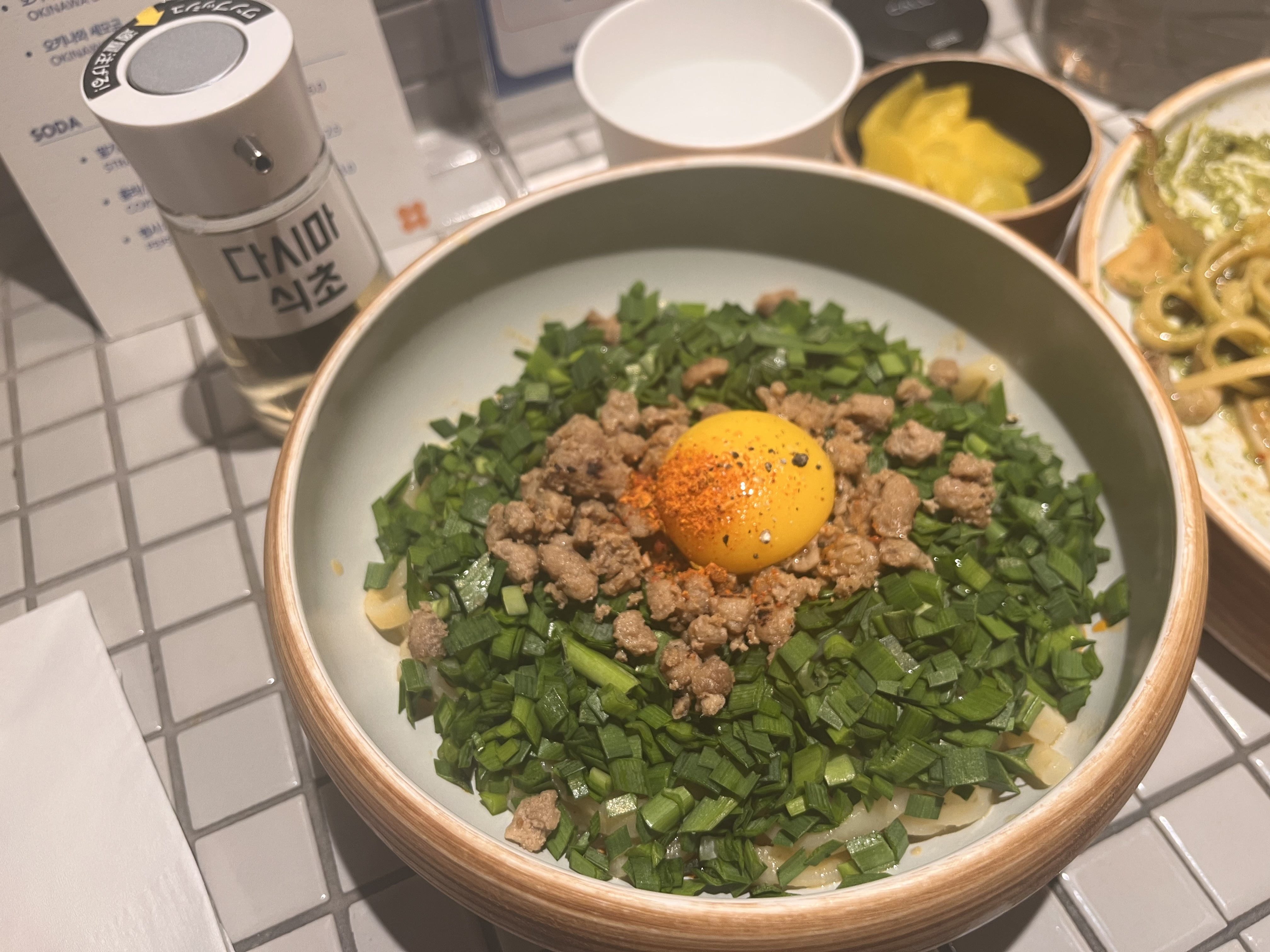 마제소바도 이름이 마제(섞다)인 만큼 부추와 반숙노른자를 먹기 전에 열심히 섞어줬구요.