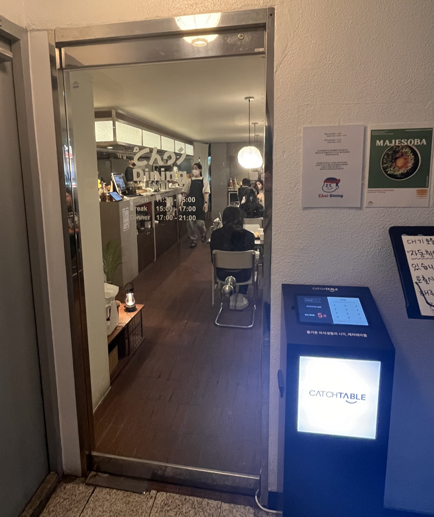 줄서기 금지라고 써있지만, 식당 앞에 두 팀 정도가 있었어요. 나중에 알고보니 대기순서가 앞으로 얼마 안 남은 두 팀이더라구요. 캐치테이블이라는 프로그램으로 내 전화번호를 등록하고, 대기번호를 받을 수 있어요. 대기가 얼마 남았는지 카톡으로 알려주고, 앞에 1,2 팀이 남았을 땐 식당 앞에서 대기하라고 알림을 보내주더라구요. 그래서인지 식당 앞이 붐비지는 않았어요. 저희가 평일 7시쯤 도착했을 때, 앞에 대기는 3팀 정도 있었구요. 메뉴를 뭐 시킬지 고민하다가 기다린지 20~30분 안 되서 들어간 거 같아요! 하지만 저희가 온 뒤로 점점 손님들이 오더니 나중엔 대기가 7~8팀까지 늘더라구요. 7시까진 와야 덜 기다리실 거 같아요.