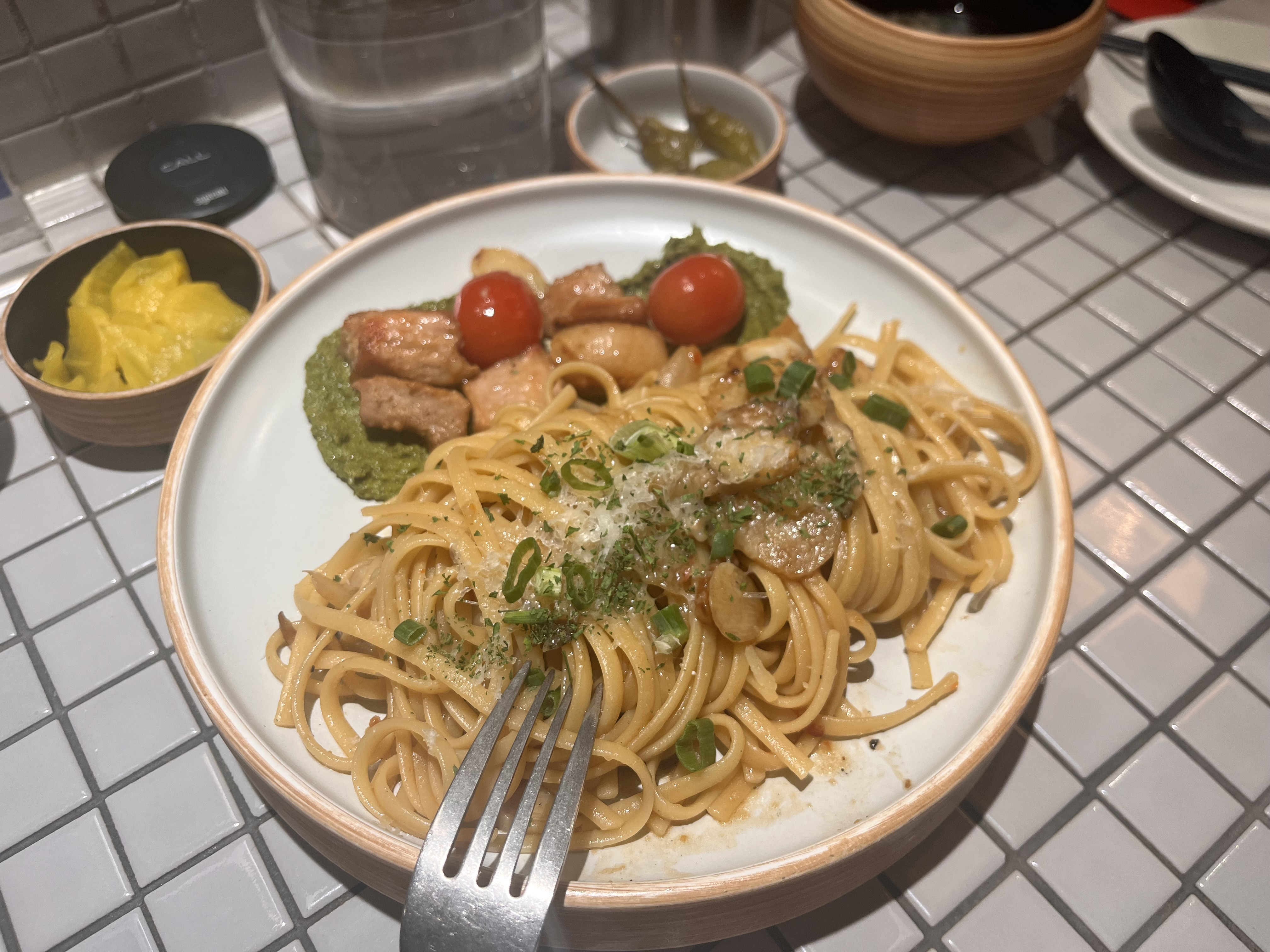 명이페스토는 처음 먹어봤는데, 약간의 신맛이 있었고, 파스타는 약간 매콤한 느낌이 있었는데