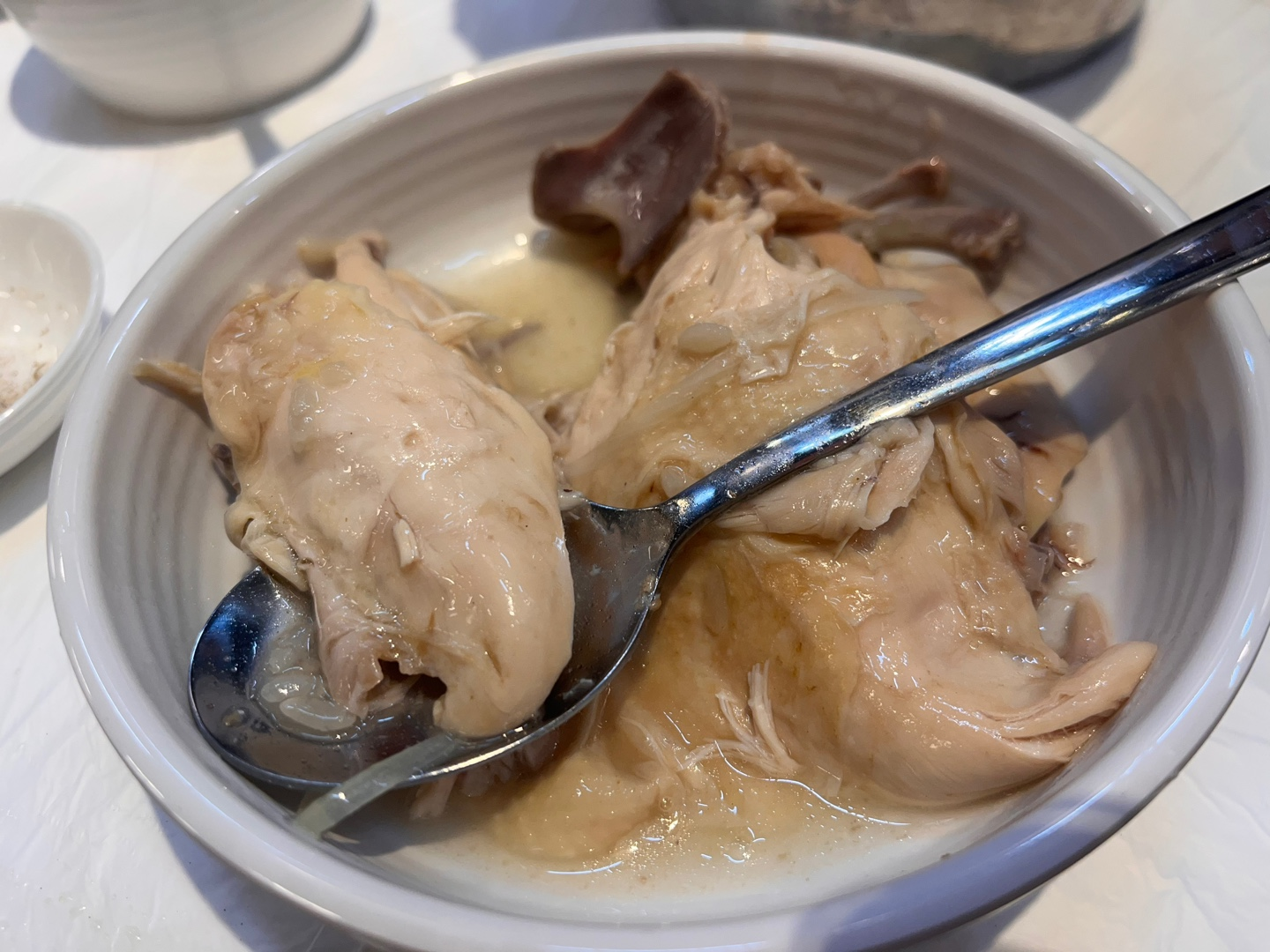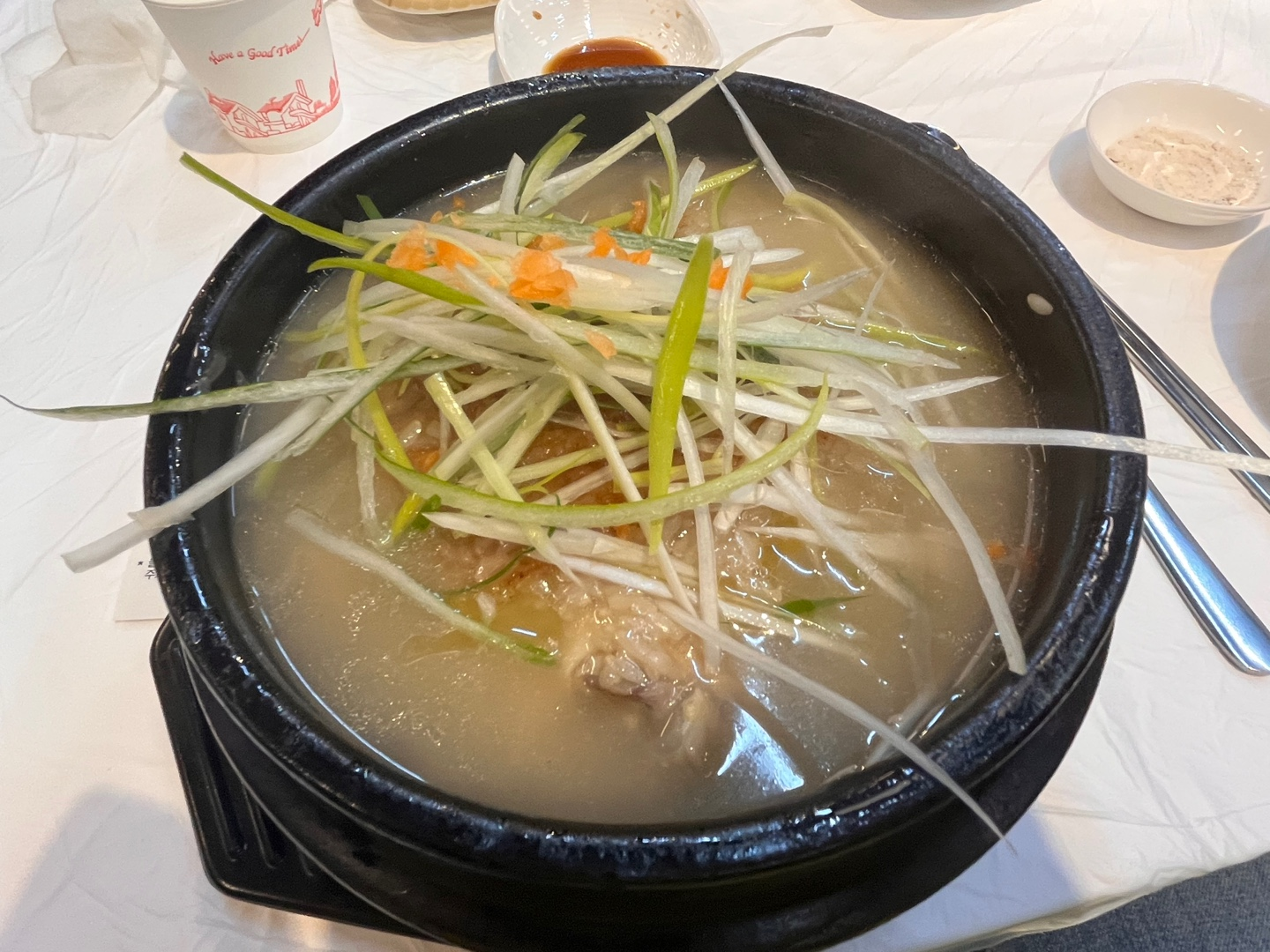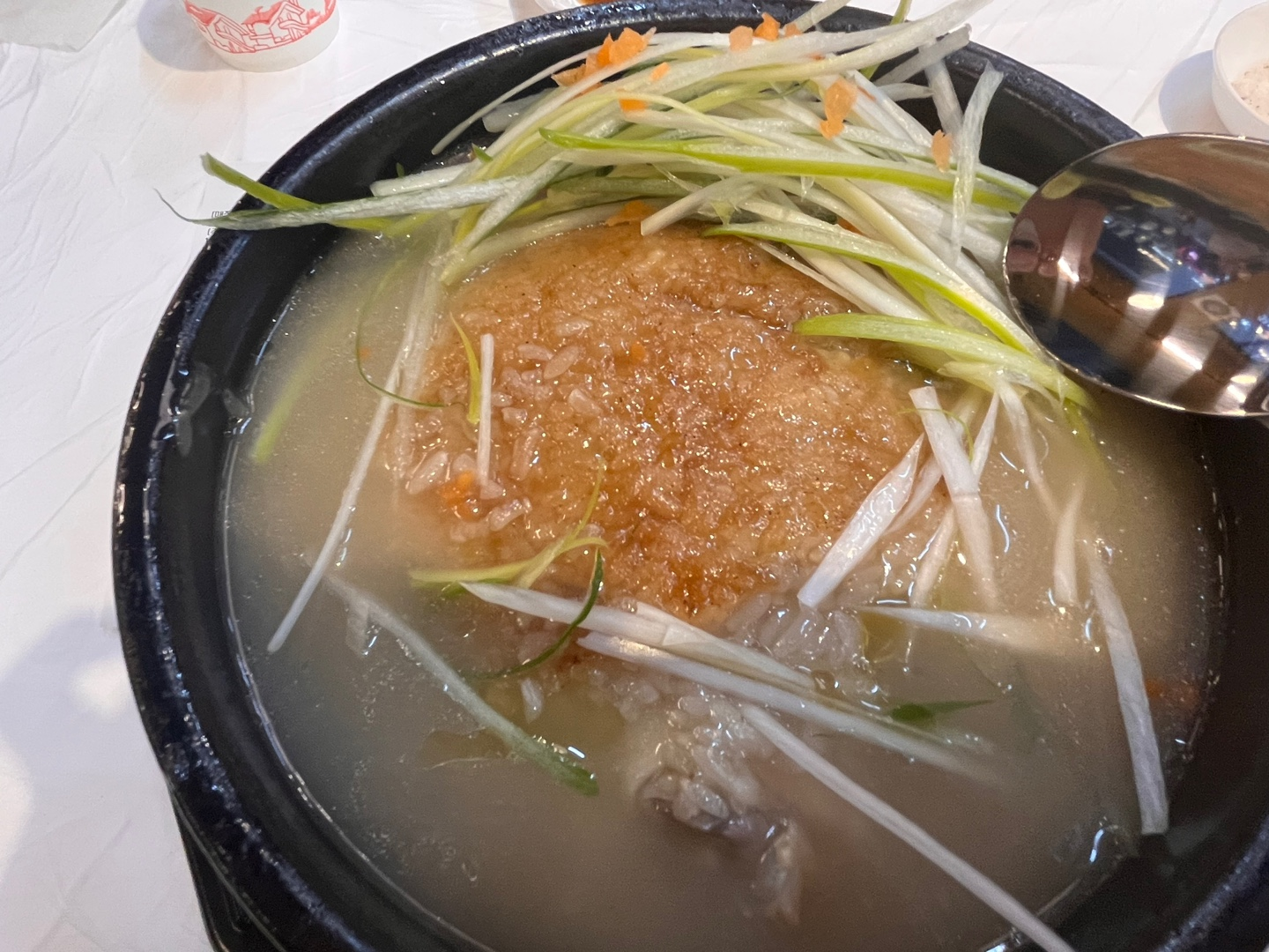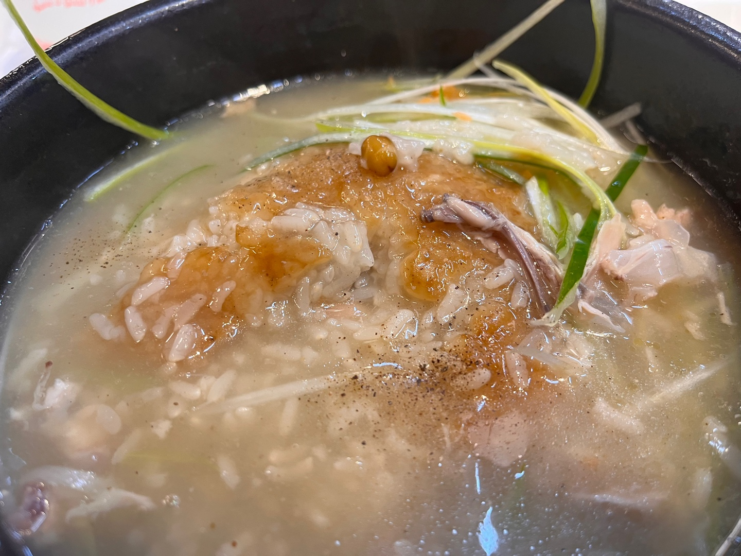 파채가 고명으로 이쁘게 올려져서 나왔는데요. 파채를 옆으로 조금 걷어내면 안에 먹음직스럽게 익은 누룽지가 나옵니다. 누룽지를 넣어서 그런지 일반 삼계탕보다는 국물이 더 희고, 걸죽했어요. 간이 많이 되어 있지는 않은 상태라서, 소금후추로 간을 하니까 확실히 고소하고 깊은 맛이 더 살더라구요! 제가 기대했던 맛이었어서 엄청 만족스러웠어요. 또 기회가 있다면 먹으러 올 거 같아요. 영계가 한마리씩 들어있고, 누룽지도 꽤 많이 들어 있어서 양이 꽤 많습니다. 일반 여성이나 소식하는 남성이 먹으면 남길 거 같아요. 나중에 보니 같이 간 일본손님도 맛있었는지 인스타에 호평과 함께 사진을 올렸더라구요. ㅎㅎ뿌듯😊