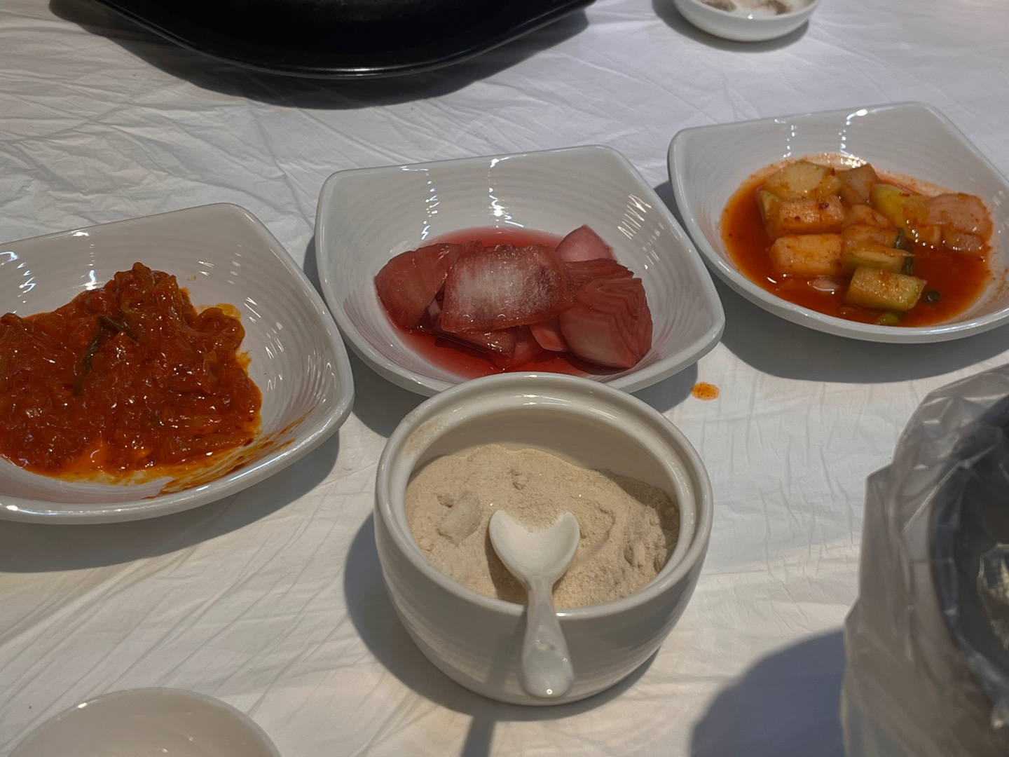 왼쪽 사진에 있는 만두는 "능이만두"인데, 메뉴판에 없어서 따로 판매는 안 하시는 것 같고, 네이버영수증 후기를 쓰면 만두 6개가 서비스로 준다고 하더라구요. 만두피가 얇고 투명해서 먹음직스러워 보이죠! 실제로 샤오롱빠오처럼, 혹은 그보다 더 육즙도 가득하고 만두피가 얇으면서도 쫄깃해서 정말 맛있었어요!! 이거 단독메뉴로 장사해도 팔릴 거 같아요. 후기를 어떻게 썼나 확인까진 안 하시는 거 같아서 솔직하게 후기 쓰셔도 되니까 꼭 추가해서 드시는 걸 추천해요! 밑반찬은 특이하게 볶음김치가 나오더라구요. 그 외에는 깍두기랑 양파절임이 나왔어요. 깍두기는 약간 익은 정도로 나오고, 볶음김치는 꽤 매콤한 편! 소금도 함초 천일염이라서 고혈압이나 당뇨에 좋다고 써있더라구요.