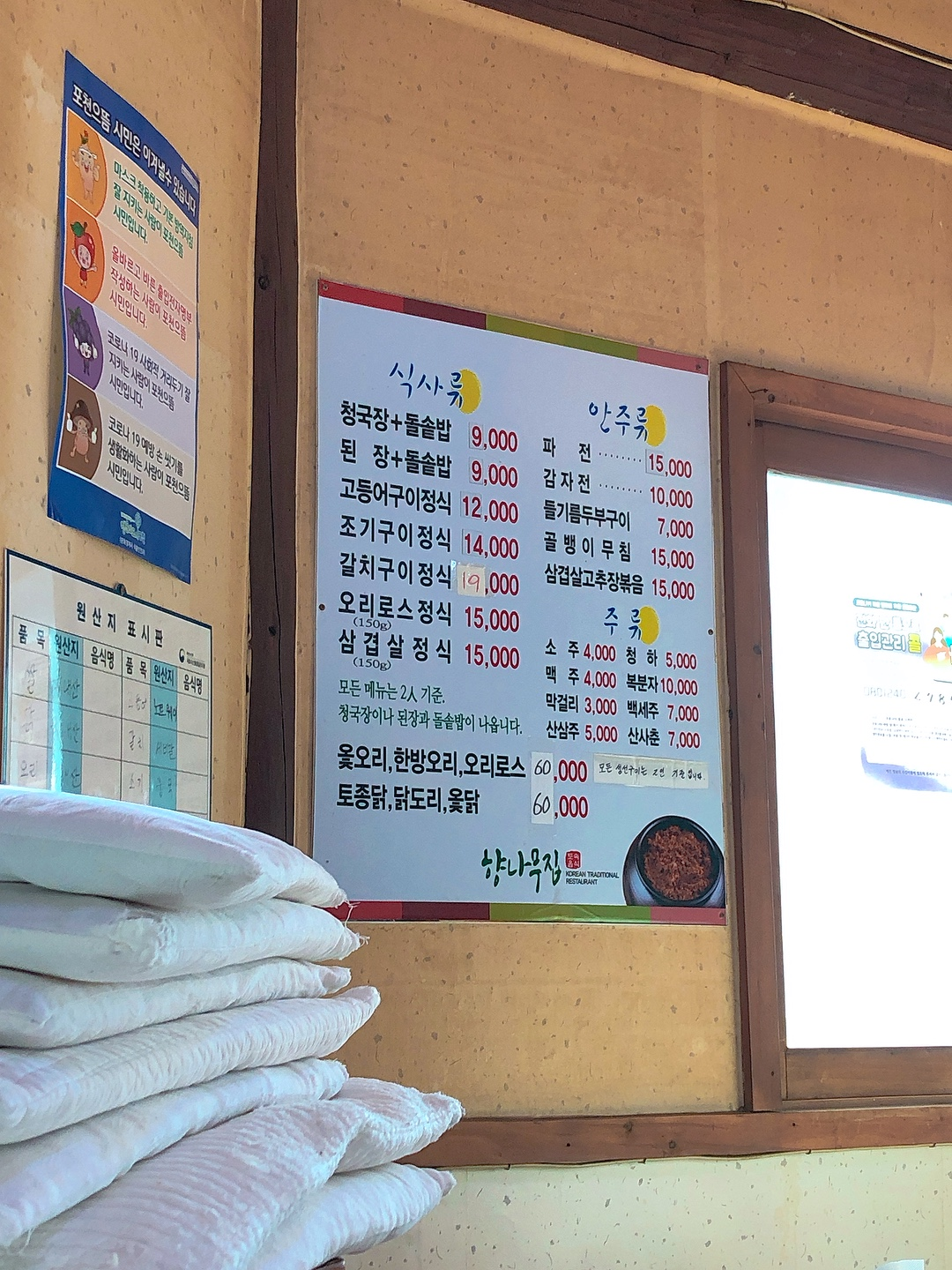 창문 옆에 메뉴판이 붙어 있었는데, 모든 메뉴는 2인 기준가격이고,