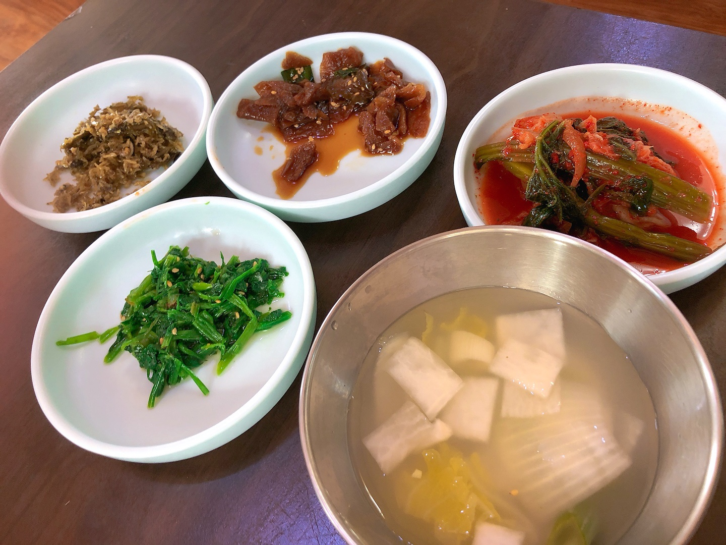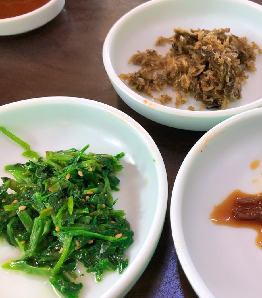 밑반찬은 멸치볶음?, 짠지볶음?, 산나물무침, 김치, 열무김치?, 동치미, 시레기무침?, 동치미, 알감자조림 등등이 나왔어요