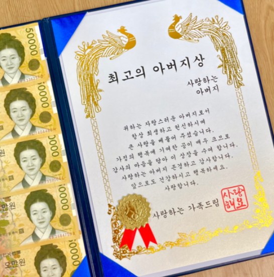 유튜브로 상 받을 때 bgm 찾아서 깔고, 상장수여식처럼 "최고의 아버지상"을 읽고 드렸어요~