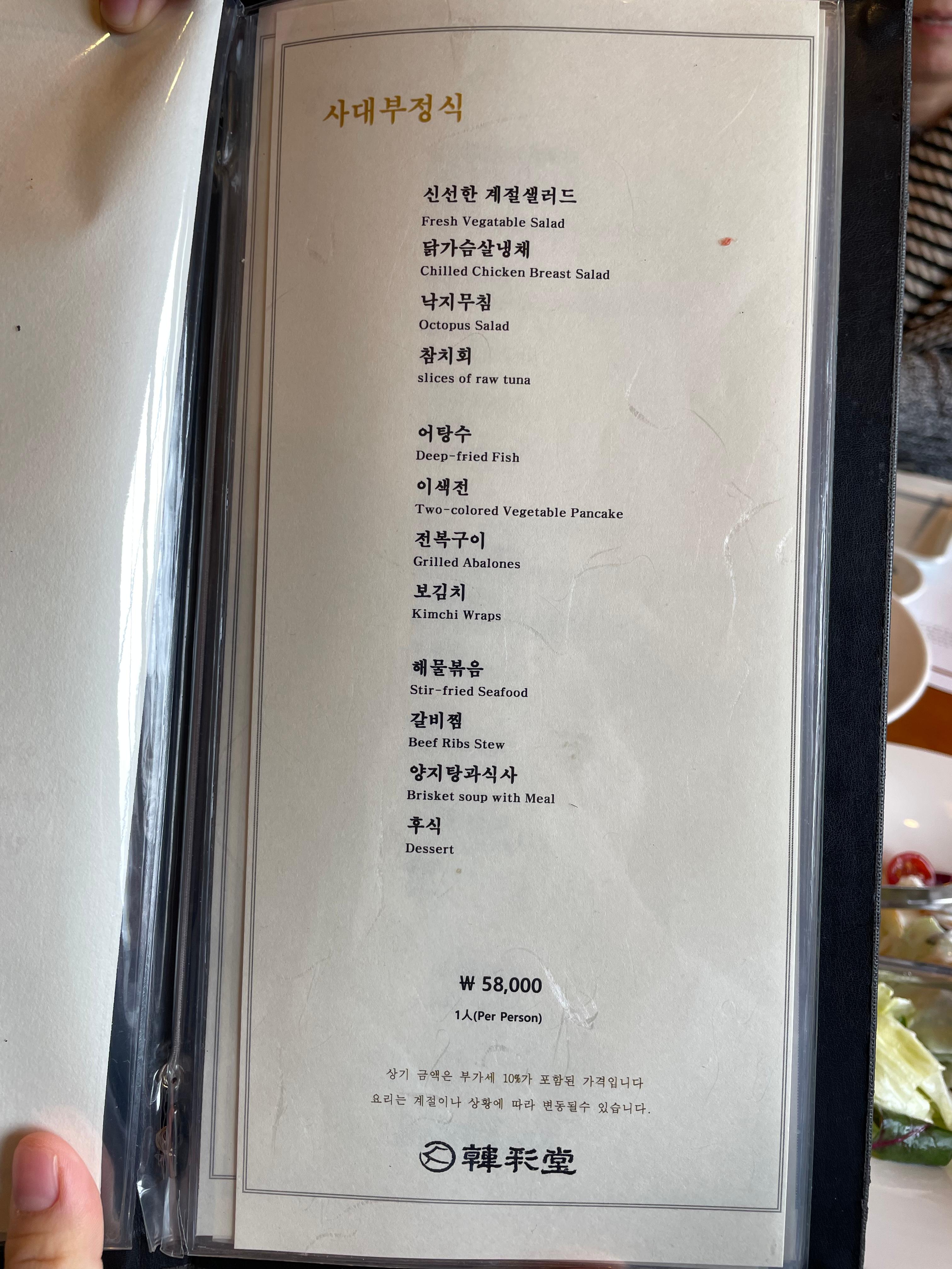 가장 많이 이용한다는 [사대부정식](1인 58,000)으로 5명 주문했어요.