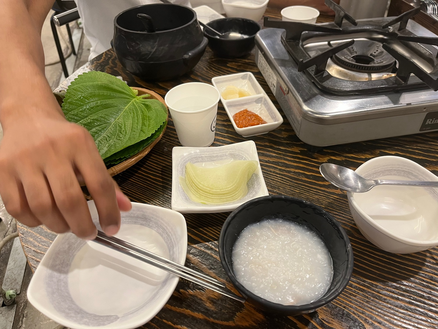애피타이저로 닭죽이 나오고, 사이드로 쌈들과 마늘, 장, 오이미역냉국이 나옵니다. 닭죽은 정말 밍밍한 맛이라 소금후추를 뿌려서 먹게 되어 있고, 오이미역냉국은 매콤한 닭갈비와 함께 먹으면 입안을 헹궈내줄 상큼한 맛이었어요. 계란찜은 추가로 주문했는데, 이 계란찜도 간이 담백한 편이었습니다.