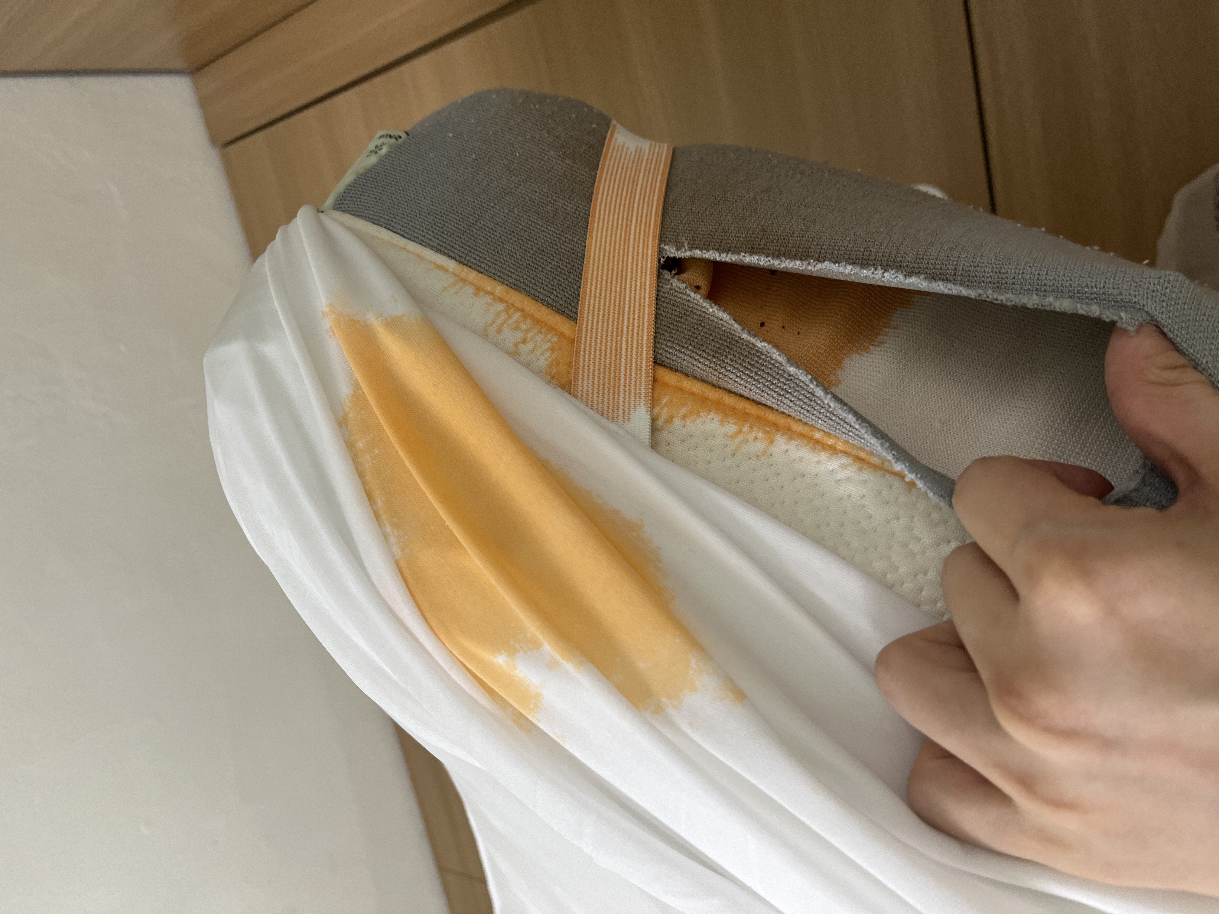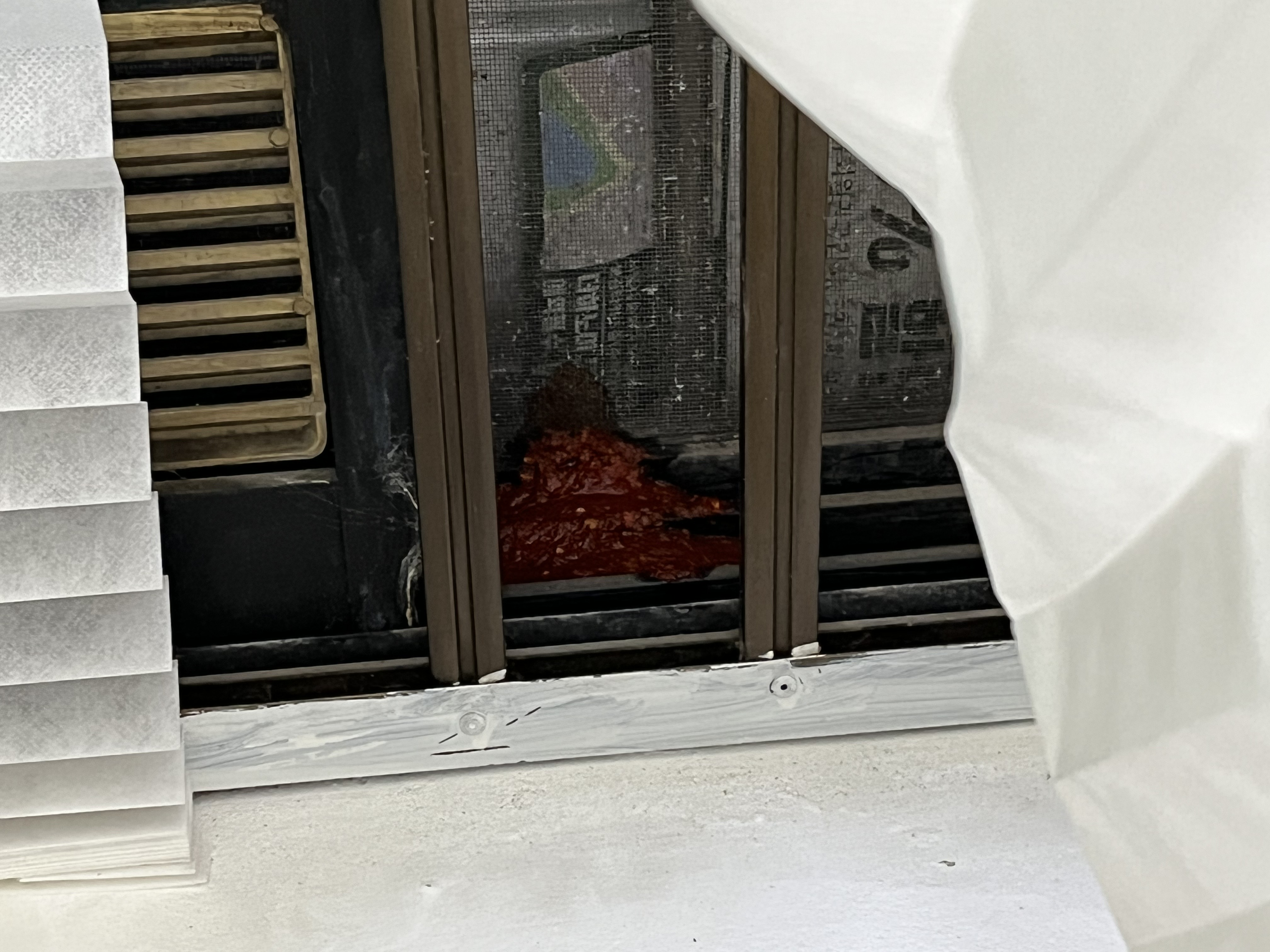 5. 퀸침대 매트리스를 칼로 찢어서 그 안에 고추기름을 넣어놓음. 고추기름이 염색이 되고 얼룩제거가 되지 않아 전부 교체해야했음.
