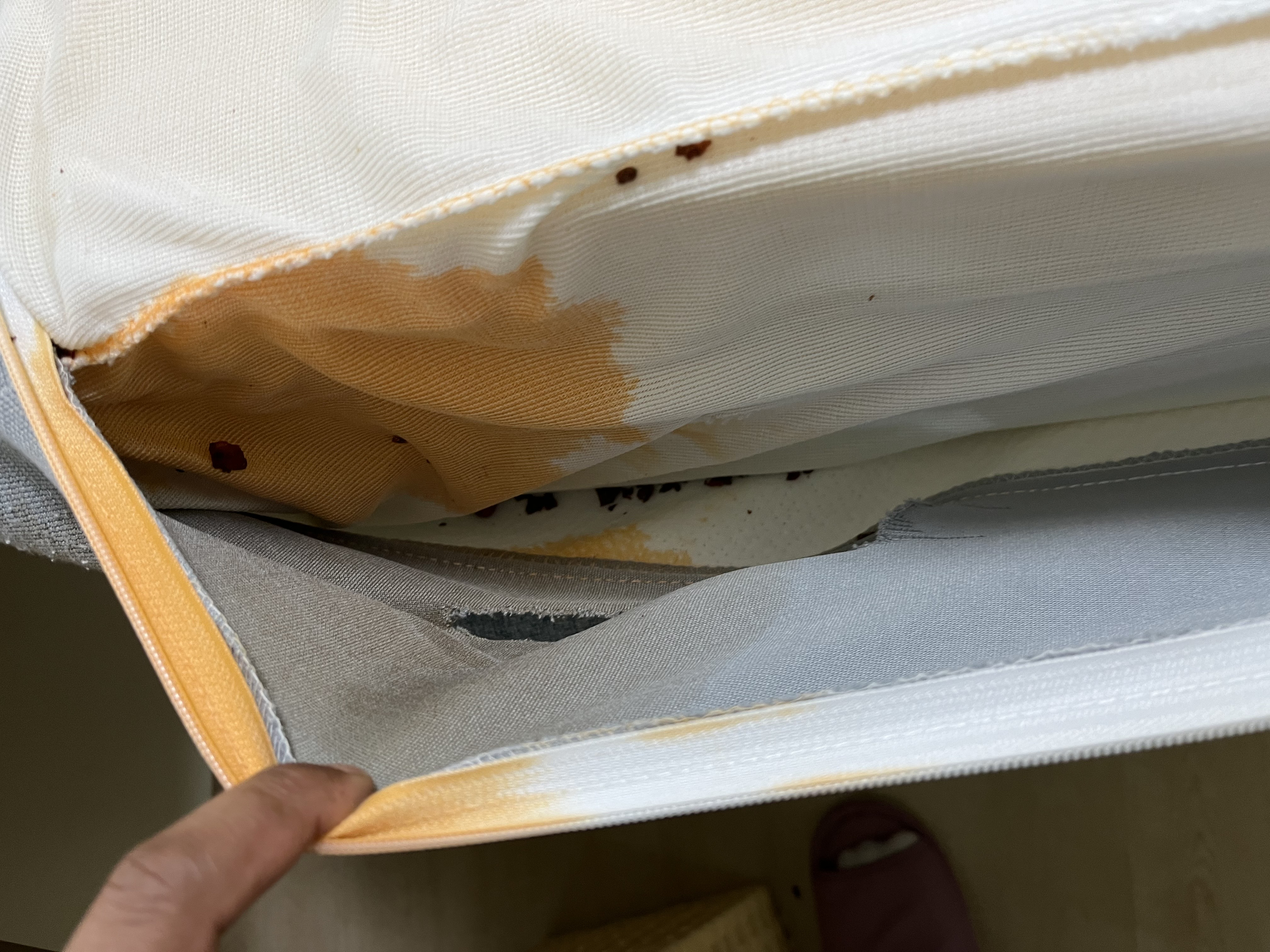 5. 퀸침대 매트리스를 칼로 찢어서 그 안에 고추기름을 넣어놓음. 고추기름이 염색이 되고 얼룩제거가 되지 않아 전부 교체해야했음.