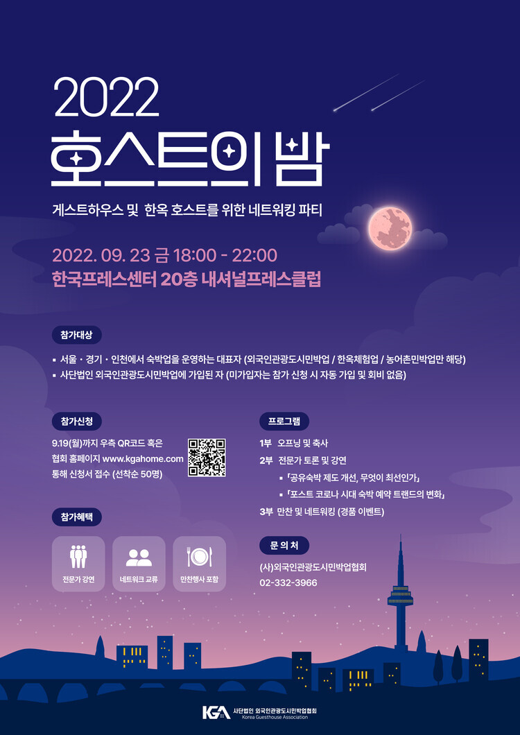 9월에 다녀온 "2022 호스트의 밤" 행사에 대해 늦게나마 후기를 써보려고 합니다. 외국인관광도시민박업협회에서 이런 행사를 주최하는 건 처음인 것 같은데요. 참가비는 무료였고, 관광사업등록증이 있어야지만 신청/입장이 가능했어요.