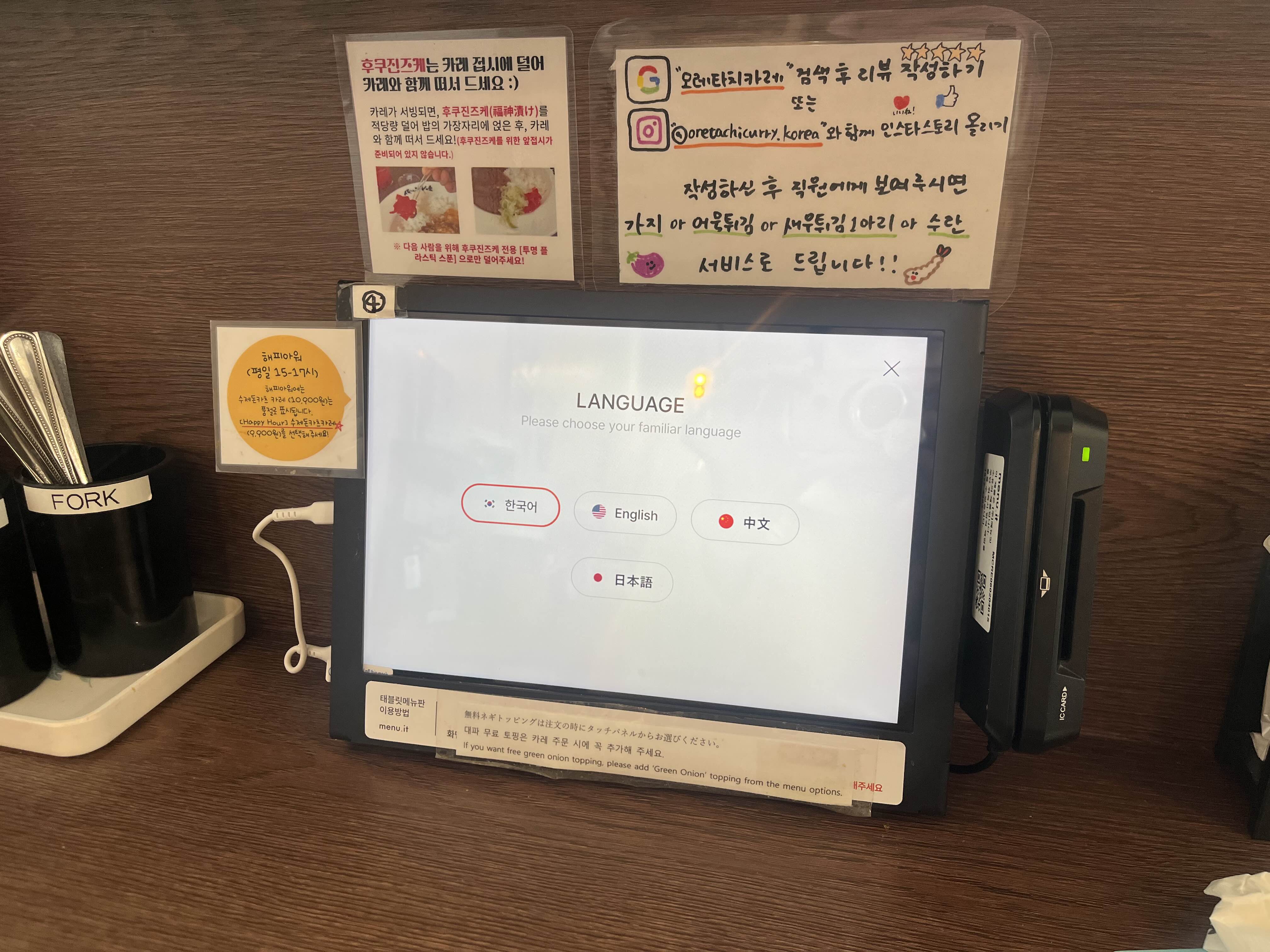 테이블마다 키오스크가 있고, 한국어/영어/중국어/일본어 다 선택 가능하더라구요.선불결제방식입니다.