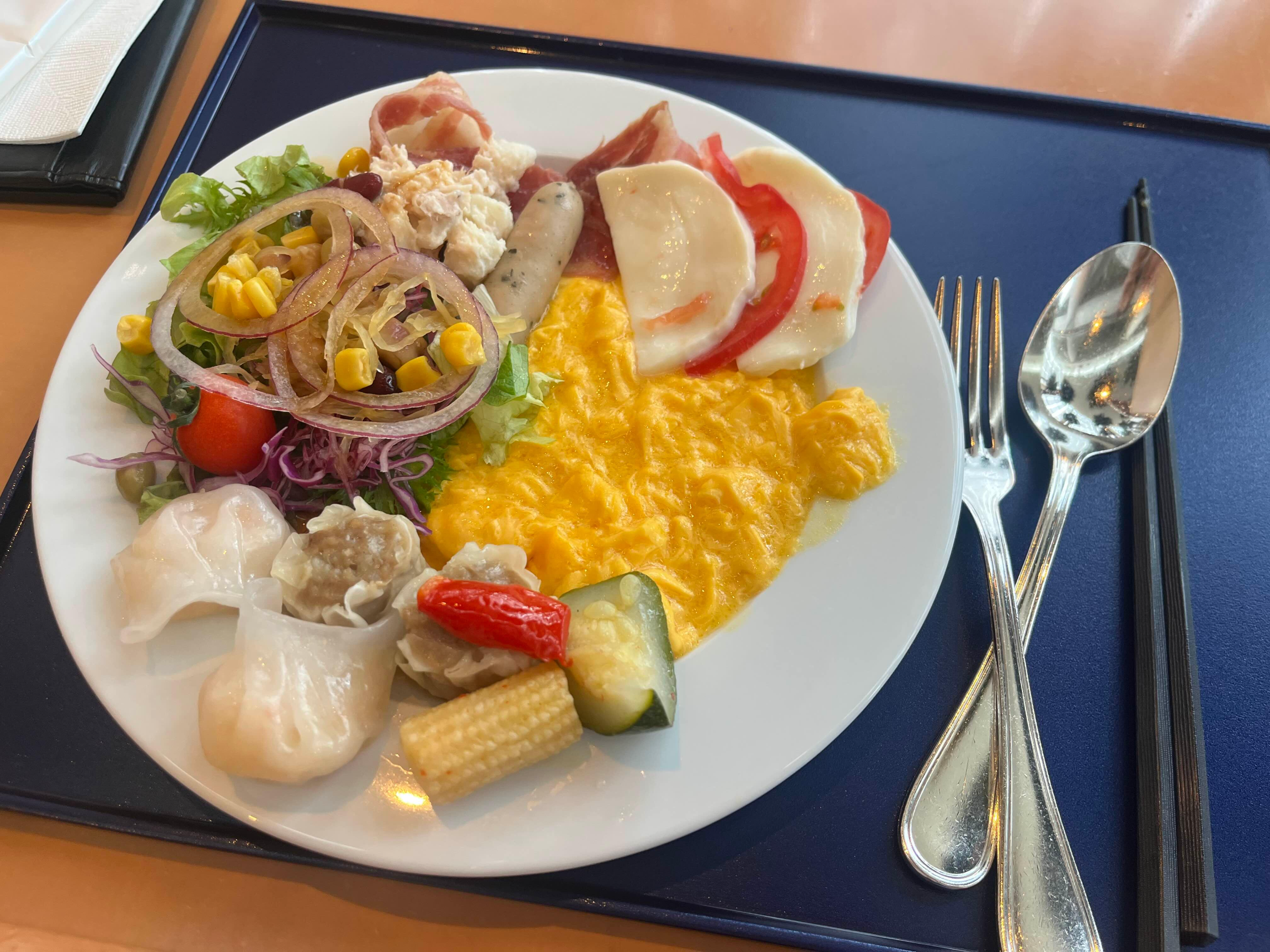 첫 플레이트로는 신선한 채소 샐러드와 스크램블, 소시지, 베이컨, 카프레제, 찐 야채들과 딤섬!