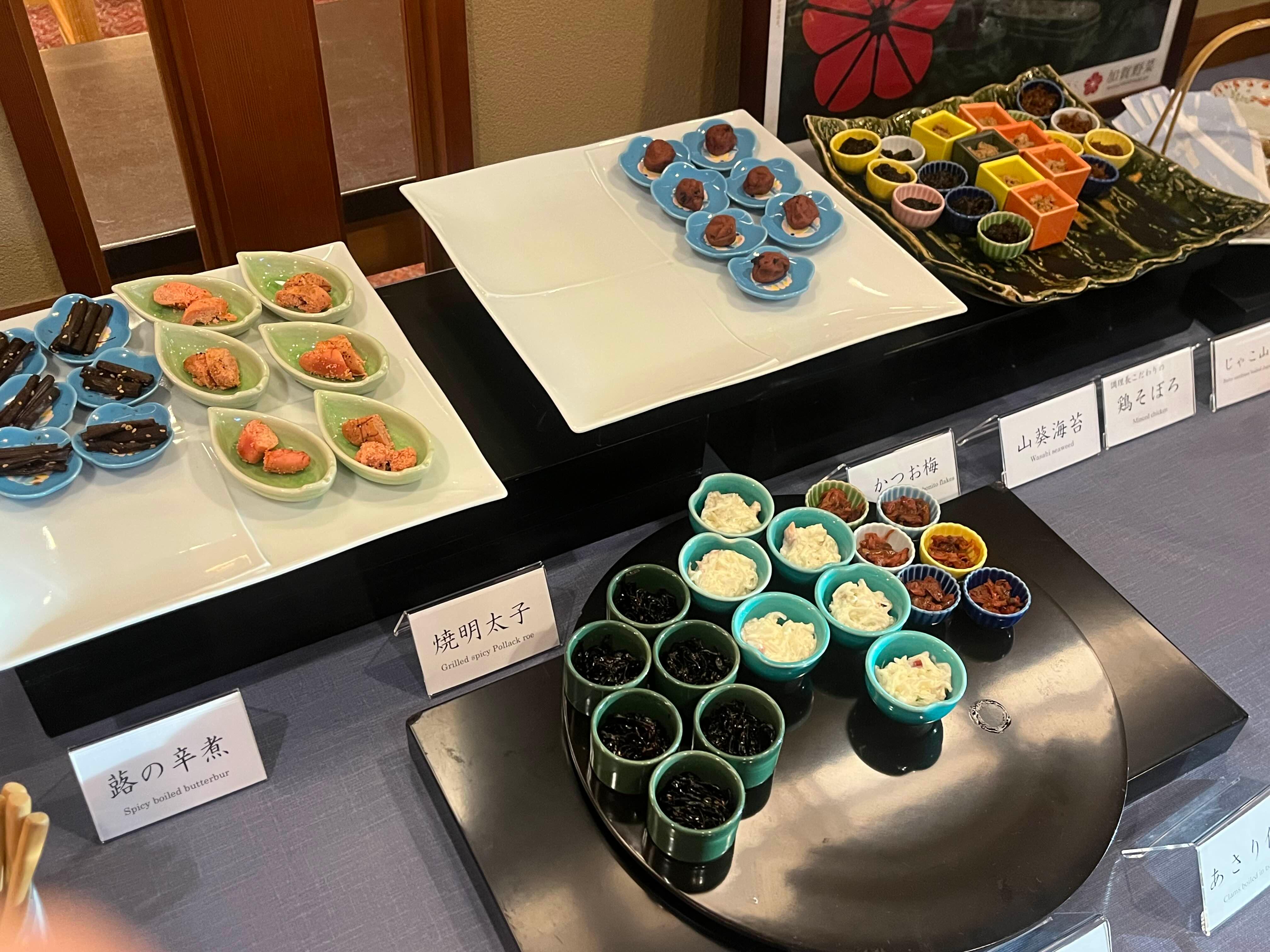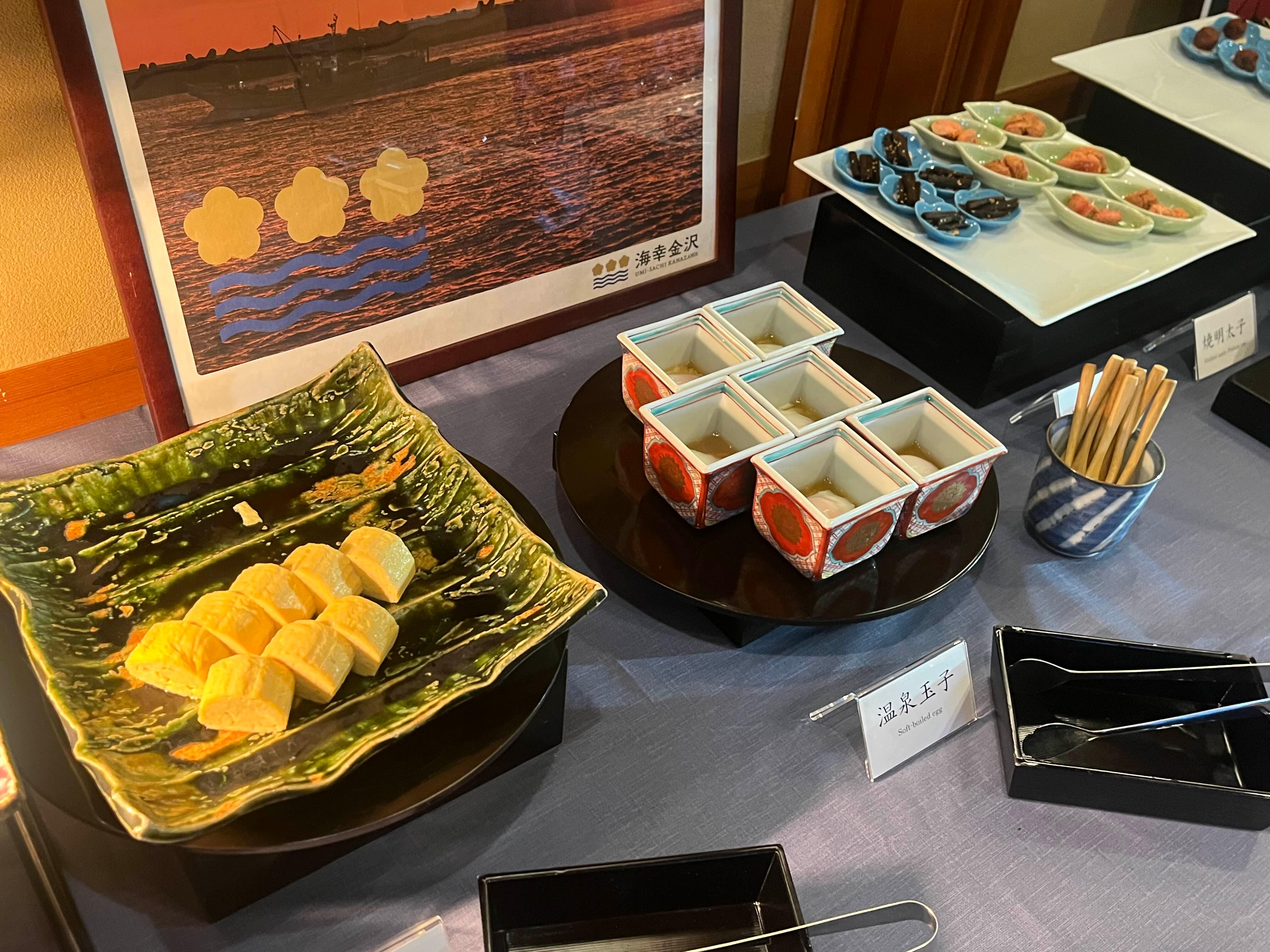 육수로 맛을 낸 계란말이와 온센다마고(수란을 간장육수에 넣어놓은), 그리고 구운 명란