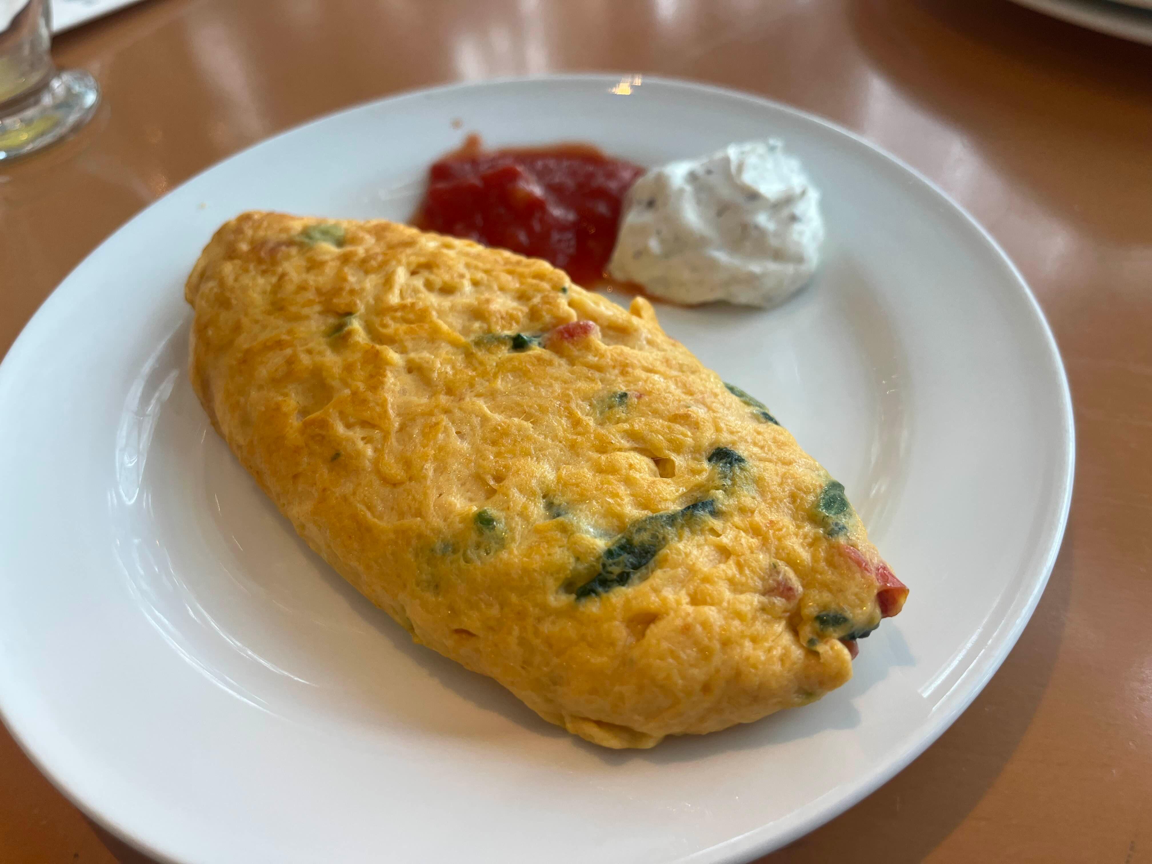 토핑은 시금치, 토마토소스, 파마산치즈, 베이컨 등이 있었는데, 제 생각엔 그냥 오믈렛에 치즈만 넣어서