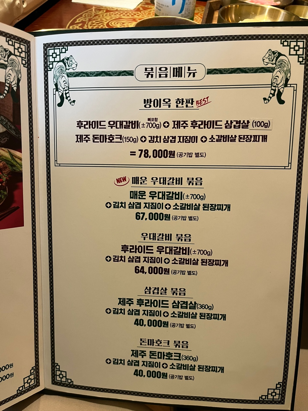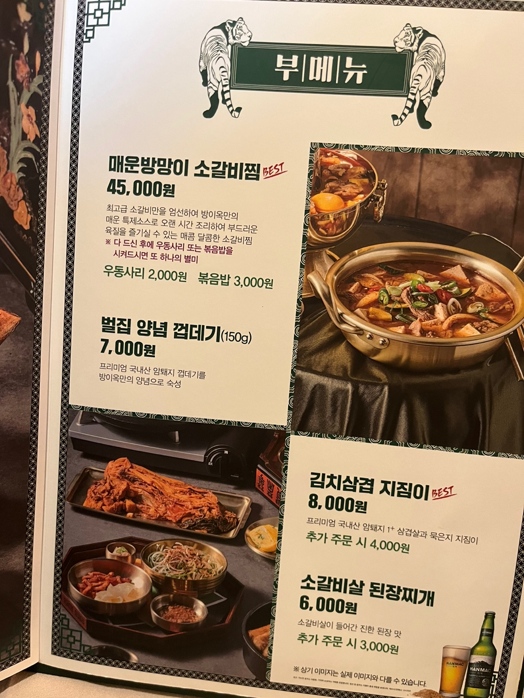 메뉴들이 고기의 양과 크기로 압도하는 비쥬얼.. !! 우대갈비가 대표메뉴이긴 하지만 매운소갈비찜이 최애인 저희 커플은 "매운방망이 소갈비찜"(45,000)을 주문했습니다. 비쥬얼 뿐만 아니라 가격도 참 압도적인 게 아쉬운.. 🤣 술과 볶음밥을 곁들이니까 둘이서 7만원이 나오더라구요. 그 가치를 하는지 이제부터 보여드리겠습니다.