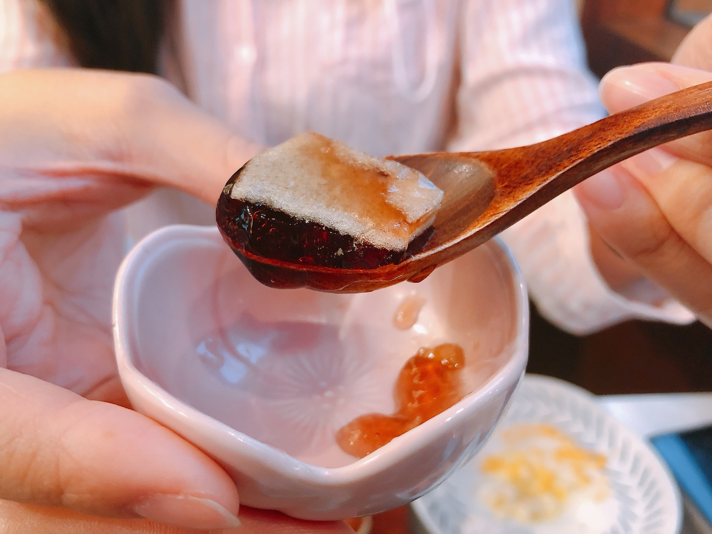 이건 따로 시킨 메뉴는 아니고, 세트에 반찬으로 포함되어 있었던 디저트인데요. 과일푸딩 같은 식감에, 포도향과 맛이 났어요. 크기가 너무 작아서 먹고나서 아쉽더라구요. 좀 더 컸으면 좋았을 거 같아요. 확실히 일본 가정식이어서인지 그릇들도 하나하나 참 귀엽죠??💕