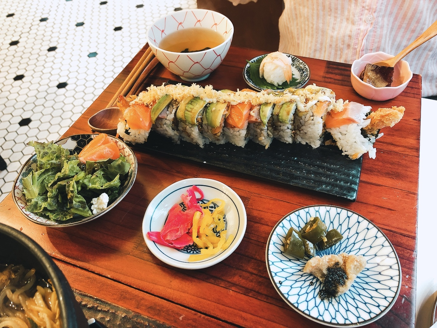 주문을 하고 기다리고 있자니, 연어와 크래미에 간장베이스소스가 들어가 있는 마키를 주더라구요.😍 다른 테이블에서도 다 받는 거 보니 기본적으로 제공되는 애피타이저인 것 같았습니다. 근데 개인적으로는 간장베이스소스가 다른 음식들에도 많이 들어가 있어서 다른 소스였다면 더 좋지 않았을까 싶어요. 좀 더 상큼하거나 톡쏘는 맛이었다면 좀 더 애피타이저의 역할을 잘 할 수 있지 않았을까 하는 아쉬움이 있었습니다. 음식이 나오는 시간은 10분 정도로 빨리 세팅되는 편이었어요.