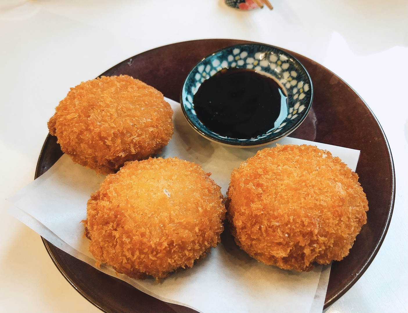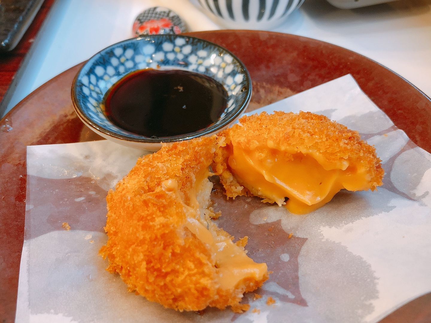 제가 성게알을 좋아해서 메뉴판에서 보자마자 바로 시킨 우니크림고로케도 제가 정말 좋아하는 스타일이었어요. 성게알과 크림이 어우러진다면 어떤 맛일지 굉장히 기대가 되었었는데, 반을 갈랐더니 사진처럼 주황색 크림이 흘러 나왔어요. 겉에서 보면 체다치즈색깔이라서, 우니가 성게알인지 몰랐던 제 친구는 치즈에서 해산물맛이 난다고 말하더라구요. 가끔 크림고로케 잘못 먹으면 정말 느끼할 때가 있는데, 여기 고로케는🤣 겉바속촉에다가 전혀 느끼하지 않고 부드럽고 너무 맛있었어요! 이것만큼은 꼭 추가주문하시길 추천합니다!
