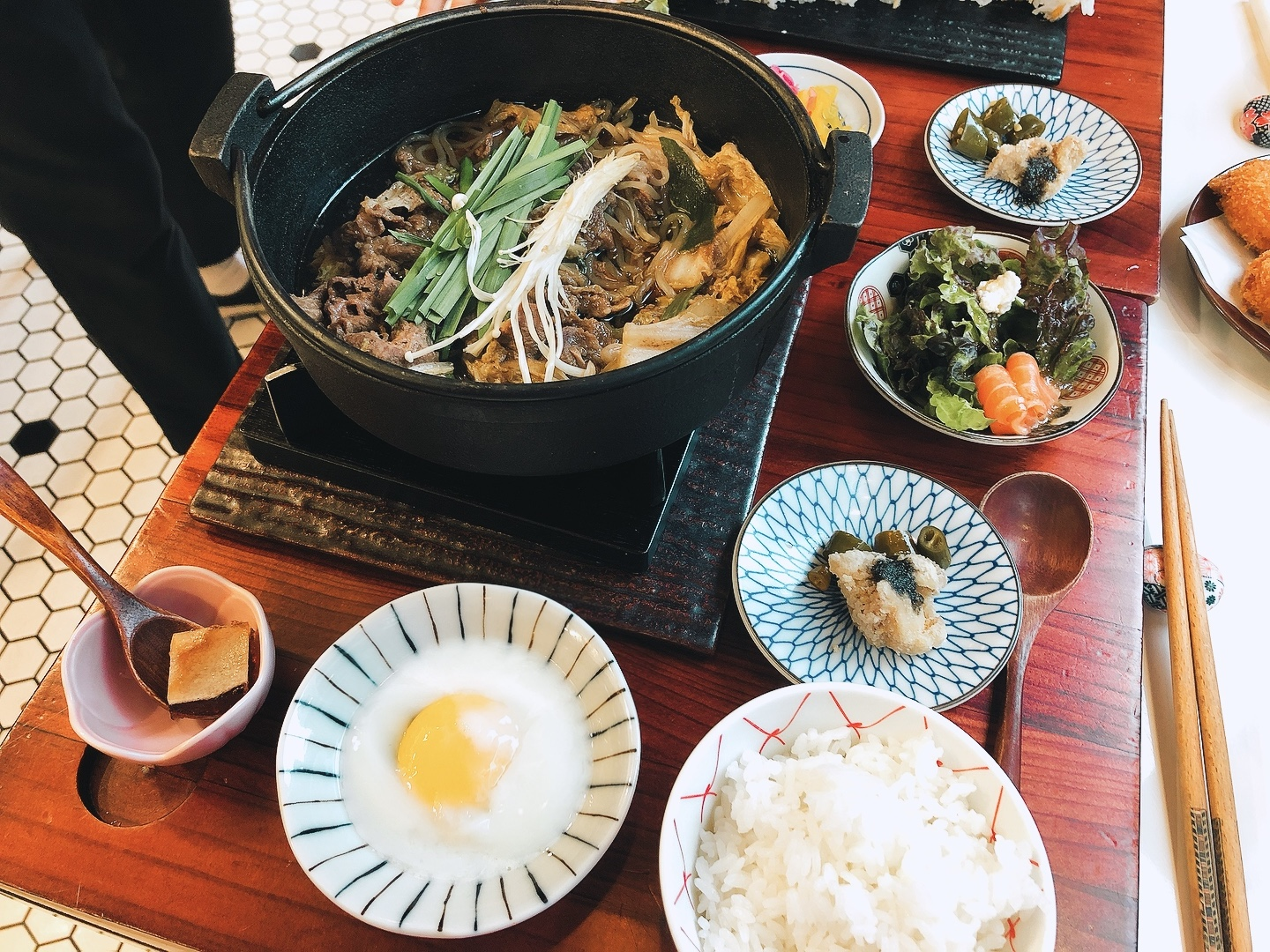 마제루롤 세트도 스키야끼 세트와 반찬구성은 비슷했는데요. 마제루롤에는 고기를 찍어 먹는 계란 노른자 대신에 국물과 새우초밥 한 점이 더 나온다는 게 다른 점이네요.