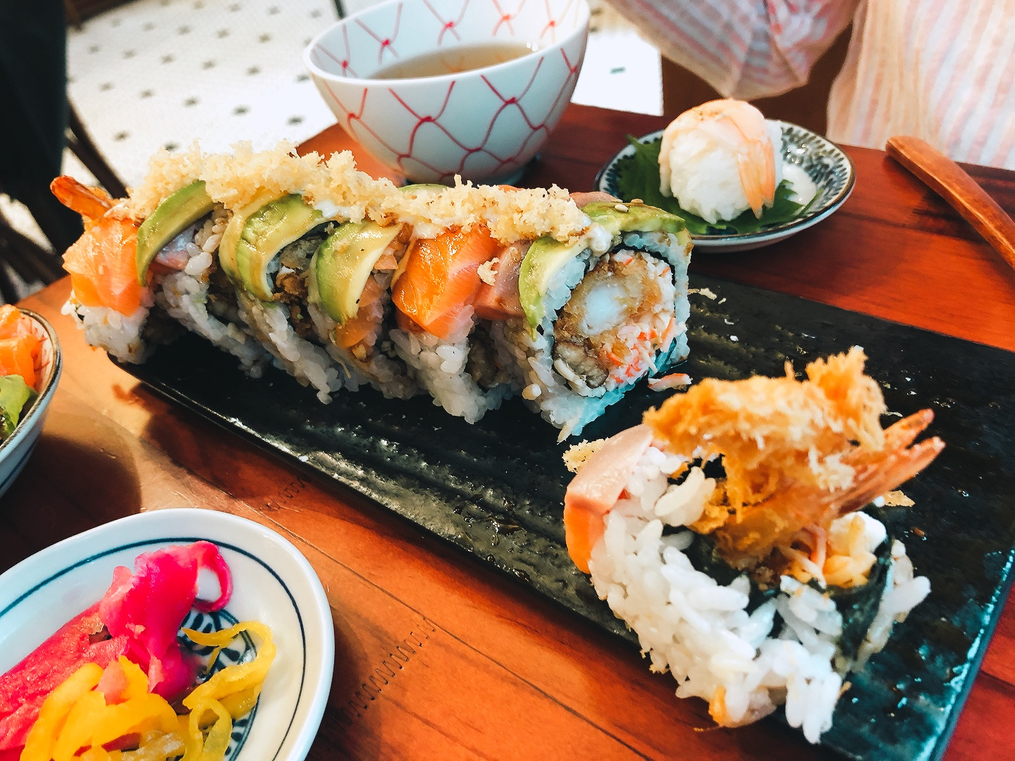 마제루롤은 마제루(섞다)롤이라는 이름답게 스시롤에 쓰이는 모든 재료가 한 번에 들어간 롤이었습니다. 연어, 아보카도, 새우튀김, 크래미, 장어 등을 하나의 롤에 다 넣었다고 보시면 되는데, 말로만 들으면 이맛도 저맛도 아닐 거 같지만, 의외로 매우 조화로운 맛이었습니다. 저 위에 뿌려져 있는 튀김가루마저 계산된듯이 너무 잘 어울렸어요! 제가 간이 짠 걸 정말 싫어하는 편인데 이 집은 음식들이 전체적으로 간이 적당해서 물리지 않고 참 잘 먹었던 것 같습니다.😊👍