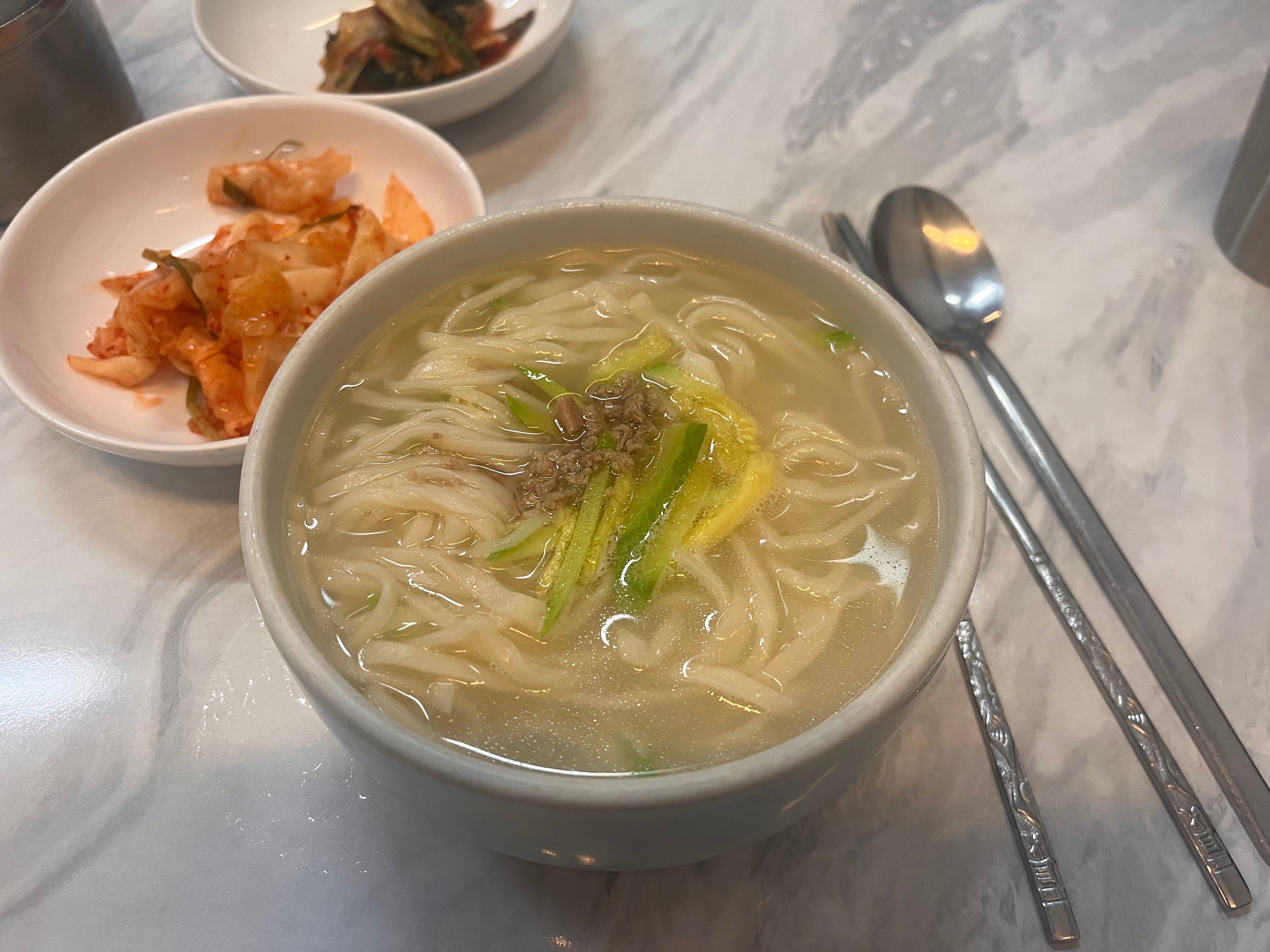 정갈하게 차려진 국시 한그릇. 고명으로 다진 고기와 채썬 애호박이 올라가 있어요. 간은 담백하다 느낄 정도의 삼삼한 간이고, 대신 고기육수라서 다대기가 없어도 든든하게 먹을 수 있을 거 같아요. 하지만 저는 조금 얼큰하게 먹는 게 좋아서 다대기를 넣고 먹었어요. 면은 보통 칼국수면보다는 얇고 부들부들한 느낌이라 부드럽게 씹히고 넘어가요. 약간 인스턴트 칼국수랑 비슷한 식감? 군더더기 없는 맛이고, 김치 또한 삼삼한 간이라 전체적으로 소박한 간. 고명을 조금 늘리면 정갈함이 사라지려나 싶으면서도 고명이 너무 적어서 아쉬웠어요. 개인적으로는 갈비곰탕에 소면 말아먹는 게 더 맛있을 거 같은 ㅎ