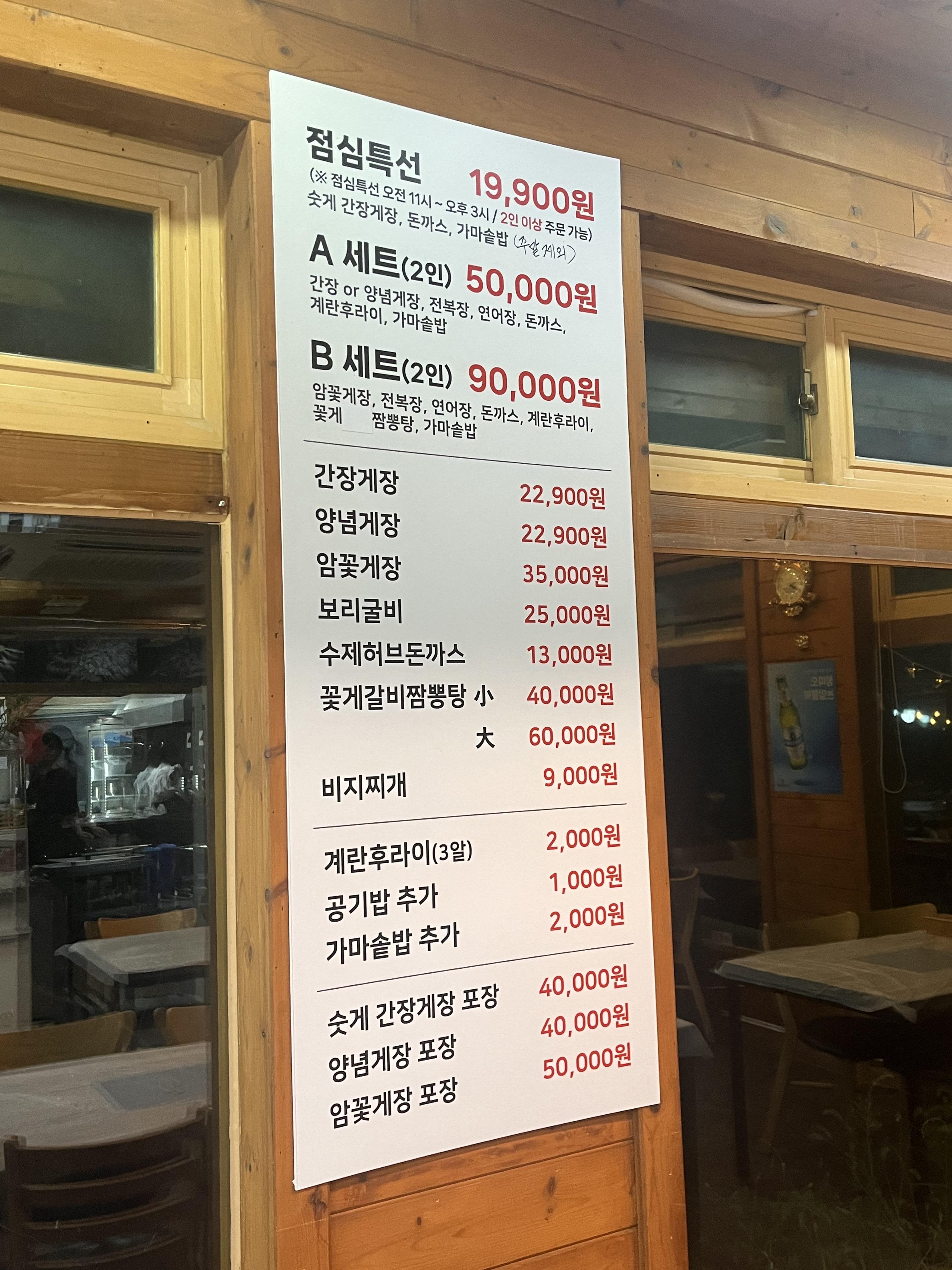 내부는 꽤나 넓은 편이었는데 평일 저녁이라서 그런지 손님이 저희밖에 없더라구요. 그래서 별로 인기 없는 집인가 해서 크게 기대는 안했는데, 후기가 좋은 집이긴 했어요. 그리고 직원들이 젊은 여성분들이라 가족이 운영하는 느낌이 들었어요. 다들 친절하세요. 세트메뉴도 있었지만, 저희는 전복장, 연어장 같은 다른 장 필요 없고, 딱 암꽃게장을 먹으러 간 거라서 3인분 주문했습니다. 3인분 시켰는데 4마리 나왔고 알이 실하고 크기는 꽤 큰 편, 공기밥이 같이 나왔던 거 같아요.