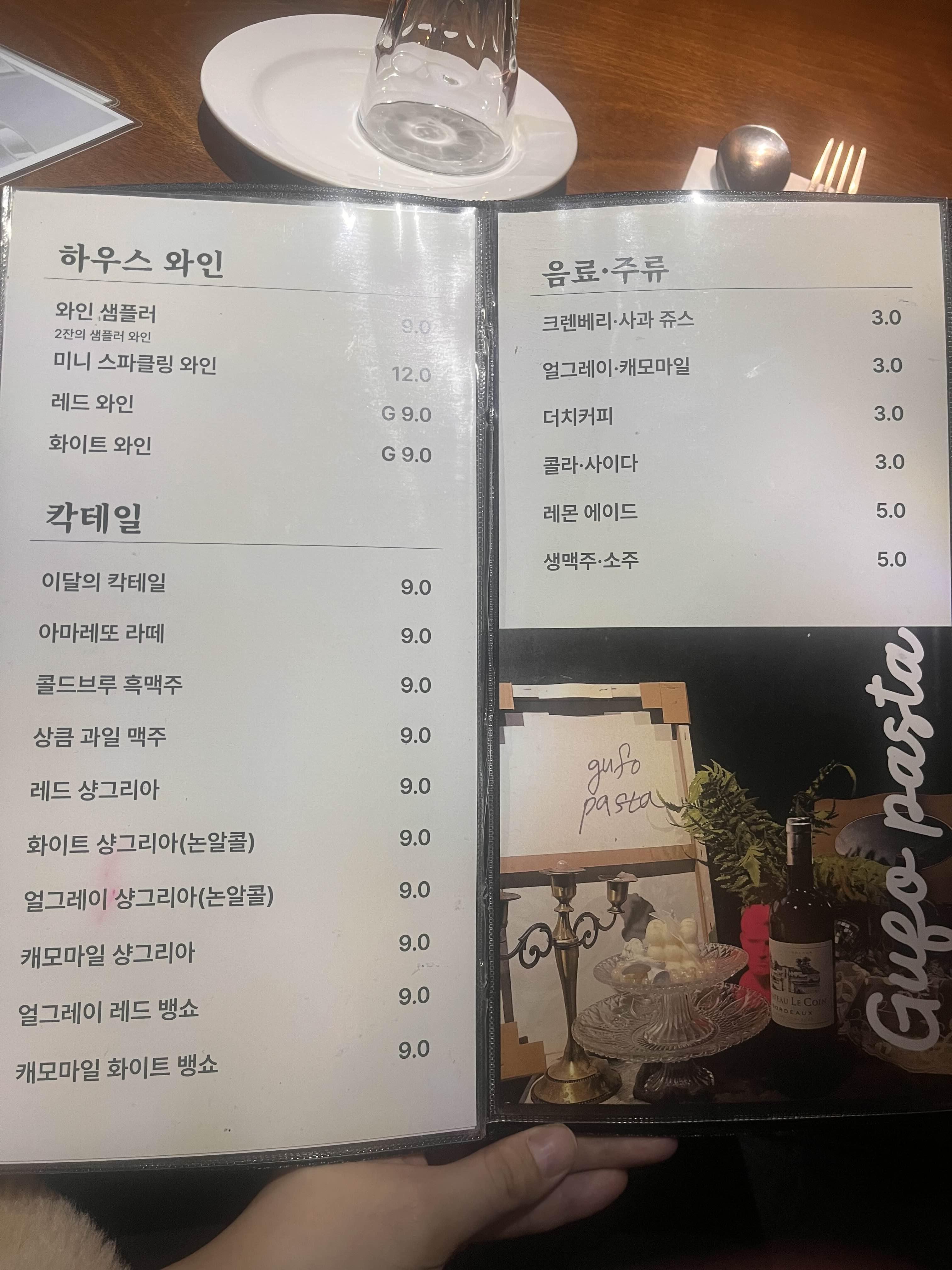 와인 메뉴판도 있었는데, 파스타별로 와인을 추천해놓은 정성 또한 너무 감동했습니다. 이런 노력들이 손님들이 좋은 선택을 할 수 있도록 신경써주고 있다는 배려를 느끼게 하는 거 같아요.