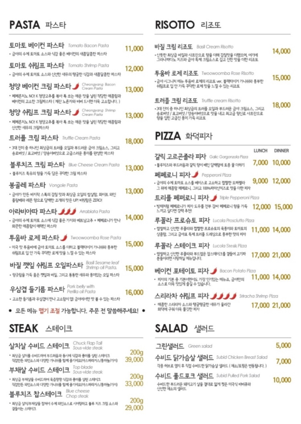 메뉴는 투움바 로제 파스타 (15,000)와 페퍼로니 피자(dinner 12,000)로 정했습니다. 후기에도 이 메뉴가 제일 인기도 많고 비주얼이 좋아서 만족도가 높은 것 같더라구요! 피자는 런치에는 3000~4000원 정도 더 싸게 먹을 수 있나봐요!