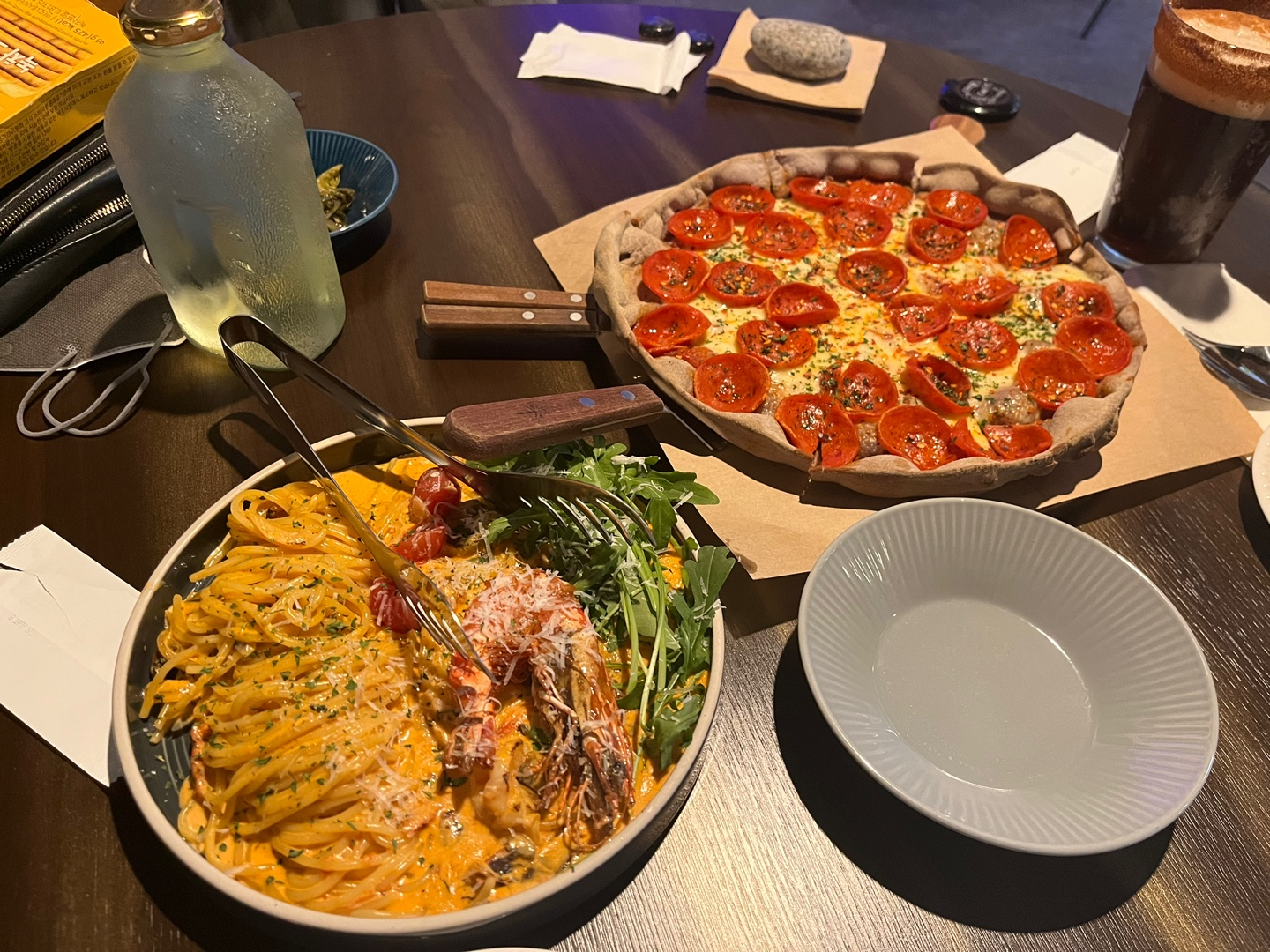 페퍼로니 피자도 도우가 얇고 화덕피자라서 그런지 느끼하지 않고 빵도 맛있었던 것 같아요. 투움바로제파스타는 아웃백투움바와는 완전히 다른 느낌으로, 체다치즈의 맛이 많이 느껴져서 맥앤치즈를 파스타로 만들어놓은 느낌? 맥앤치즈를 좋아하는 저는 매우 취향이었어요! 새우도 크기별로 세 가지나 들어가 있는데, 탱글탱글해서 정말 맛있더라구요. 열무로 만든 피클도 별미였어요. 여자 둘이서 하나도 안 남기고 진짜 싹싹 긁어먹었네요.😆 전체적으로 간도 적당하고 맛도 비주얼도 취향저격이어서 다음에도 다른 메뉴 먹어보러 올 거 같아요! 가격도 이 정도면 괜찮은 편인듯. 우리집 주변에 이런 데가 있었으면 하는 곳이었어요. 꼭 식사 아니더라도 간단히 마시러 가거나 2차로 가는 것도 좋을 것 같은..! 저희가 번개만남 한 거라서 저녁 먹을 수 있는 시간이 1시간밖에 없어서 혹시나 웨이팅 있을까봐 가는 길에 전화드렸었는데, 당일예약도 받아주시고 직원 분들도 매우 친절하셨던:)