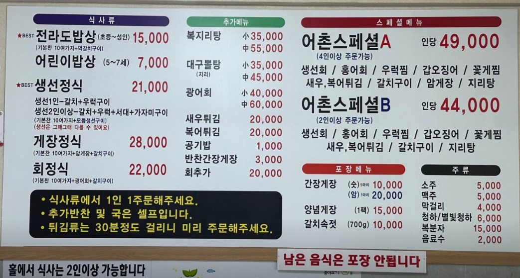 보통 서울에서 암게장 먹으려고 하면 1명당 35,000원 정도 드는 거 같은데,여기는 28,000원..!그것도 갈치구이와 제육볶음이 포함된 전라도 한상차림이 나오는 거라서매우 가성비 있다고 느껴졌어요.3명이서 가서 게장정식2인분과 회정식1인분을 주문했습니다.