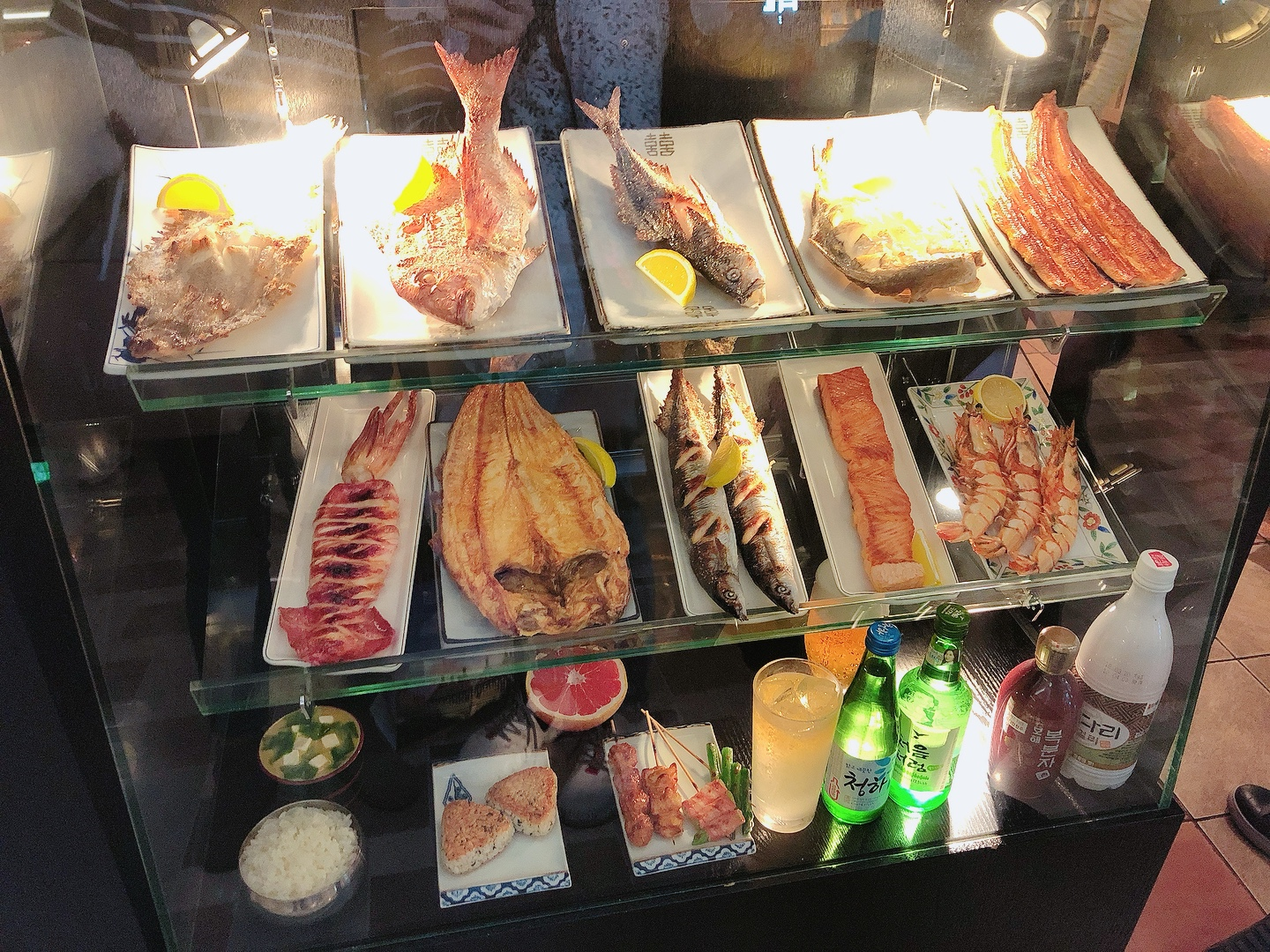 둘쨋줄 왼쪽부터 오징어, 임연수, 꽁치, 연어, 새우구이 라고 하네용