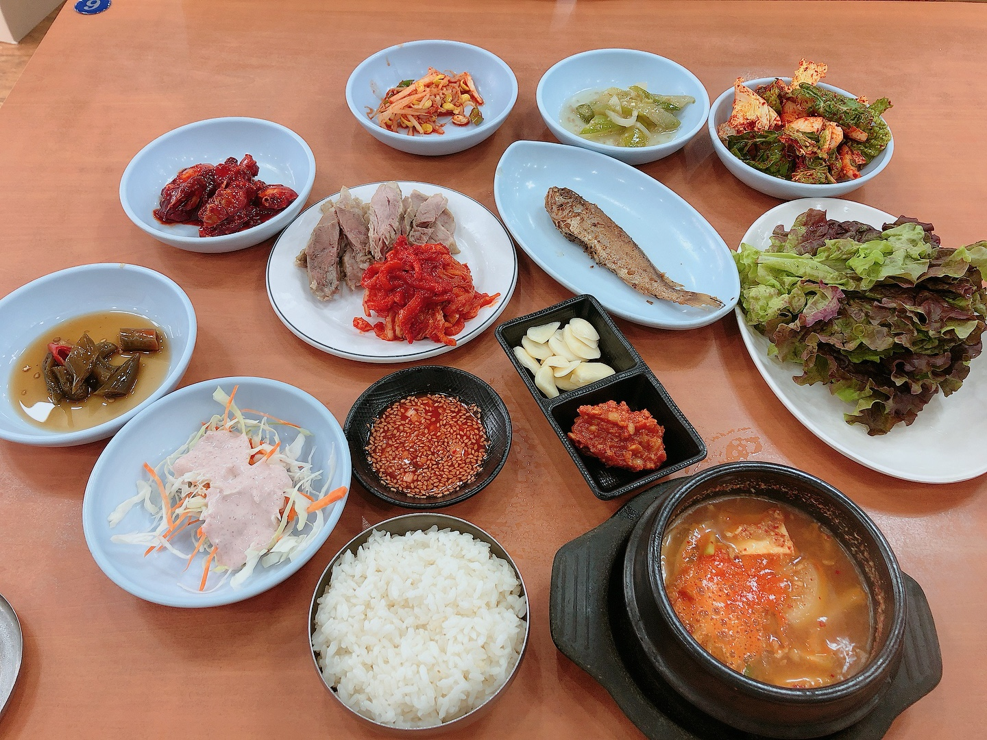 보쌈, 김치는 기본이고, 조기구이 한 마리, 된장찌개, 양념게장, 겉절이, 쌈채소, 양배추 샐러드, 그리고 밑반찬 3가지!
