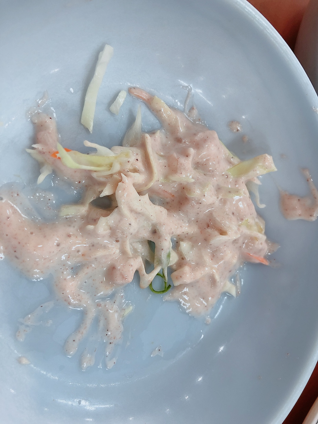 특히 의외로 이 샐러드가 너~~무 맛있었는데, 타르타르 소스 같은 맛이었어요~