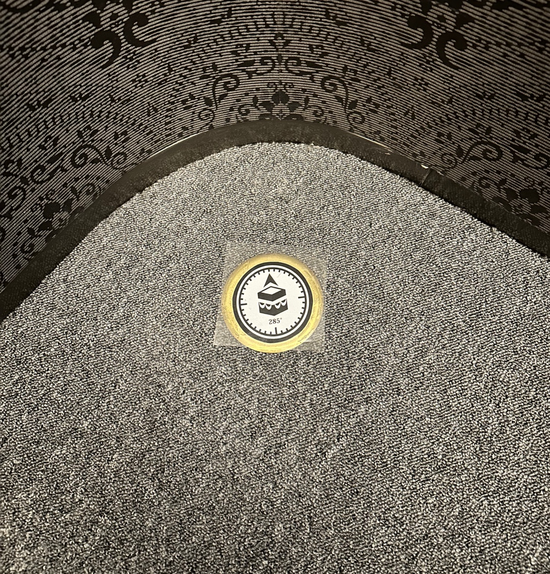 | 기도실 천장 | 여자 기도실 내부. 한쪽 벽면이 커텐으로 가려져 있지만 밖이 투명하게 보인다. | 바닥 모서리 부분에 기도를 할 방향이 표시되어 있다. |