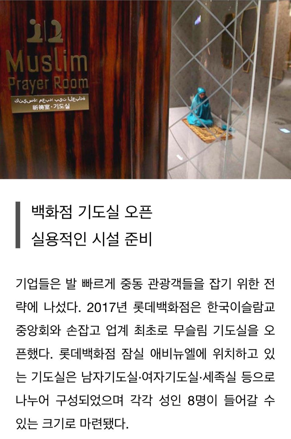 롯데는 중동 관광객들을 잡기 위해 잠실 에비뉴엘 이외에 명동에 있는 롯데 백화점에도 기도실을 만들었던 것으로 보이나, 현재 롯데 쇼핑몰과 백화점들 중 기도실이 여전히 운영되고 있는 곳은 잠실 에비뉴엘 뿐이다. 코로나 이후 일시적으로 운영이 중지되어 있었으나, 최근에 마스크의무가 없어지면서 다시 오픈하였다. 지난 3월 23일부터 라마단을 맞이한 무슬림 관광객들에게는 희소식이다. 이외에, 2020년에 서울 호텔 8곳에 만들어진 무슬림 기도실과 서울 성모병원의 이슬람 기도실도 있으나, 외부인에게 오픈되어 있는 곳은 아니고, 호텔 숙박객이나 병원 입원 혹은 외래 환자들에게만 이용이 가능한 것으로 보인다.
