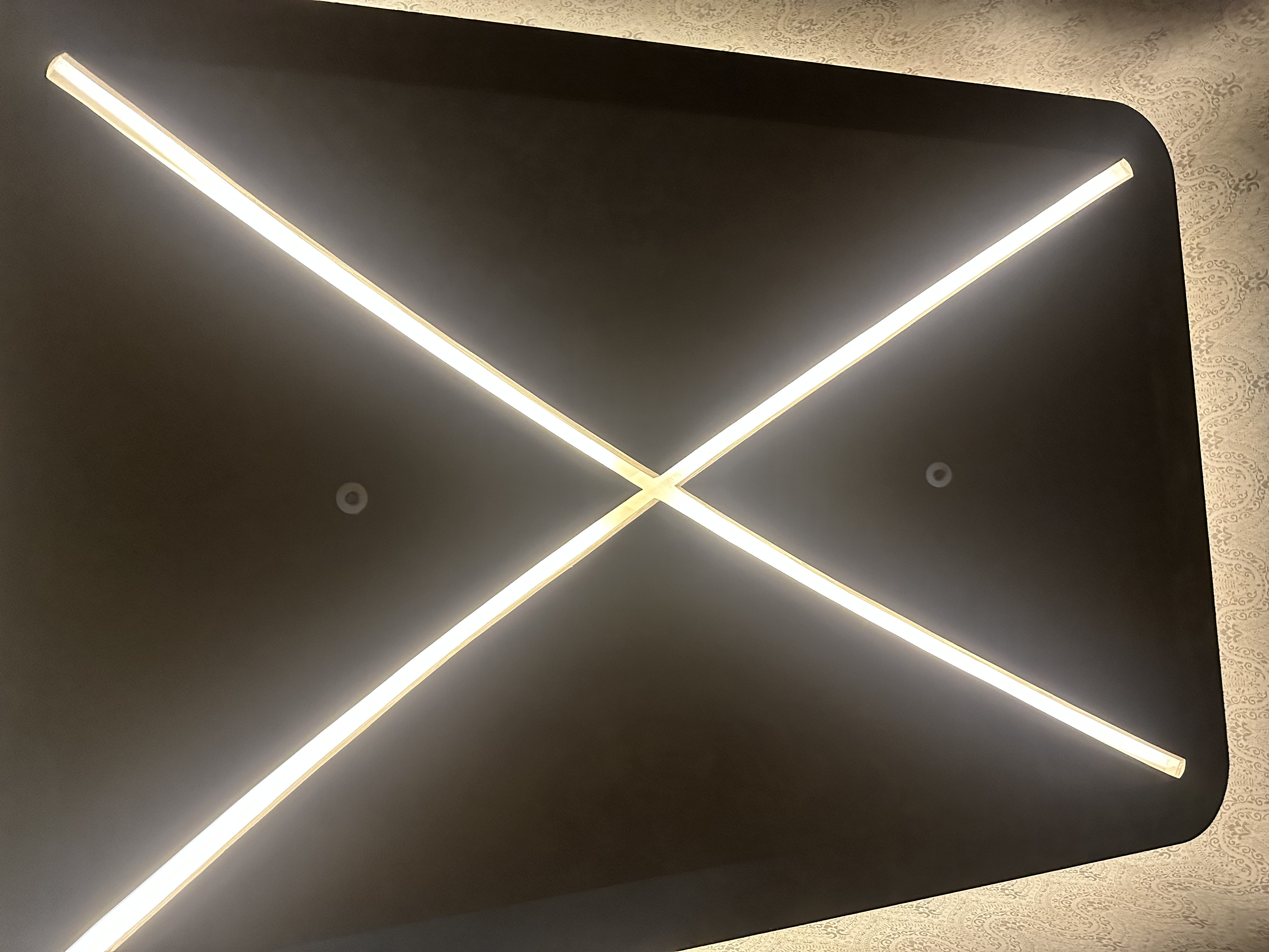 기도실 천장 여자 기도실 내부. 한쪽 벽면이 커텐으로 가려져 있지만 밖이 투명하게 보인다.  바닥 모서리 부분에 기도를 할 방향이 표시되어 있다.