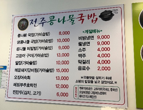 오픈하는 날에 메뉴판을 살짝 들여다보니 제일 기본 메뉴인 콩나물국밥이 8천원부터더라구요.