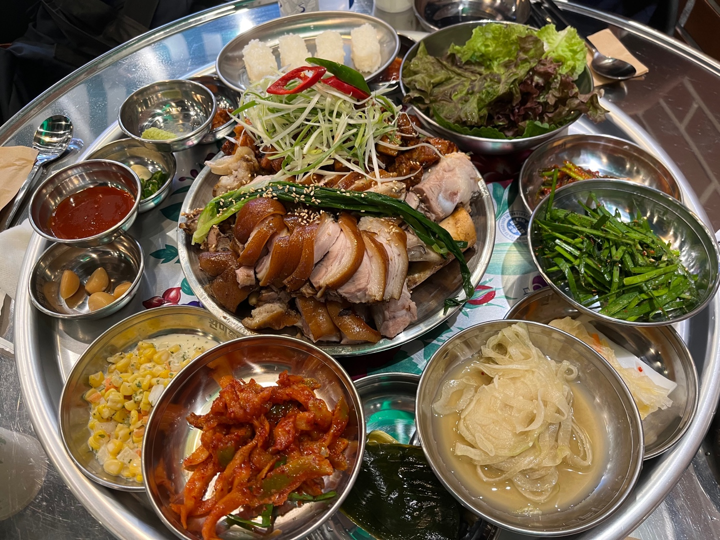 명이나물처럼 생겼지만 명이나물이 아닌 파숙지로 족발을 싸서 초장에 찍어 먹는건데, 족발에 초장이라니 신선했고 맛있었지만 제 취향까진 아니었던 걸로...