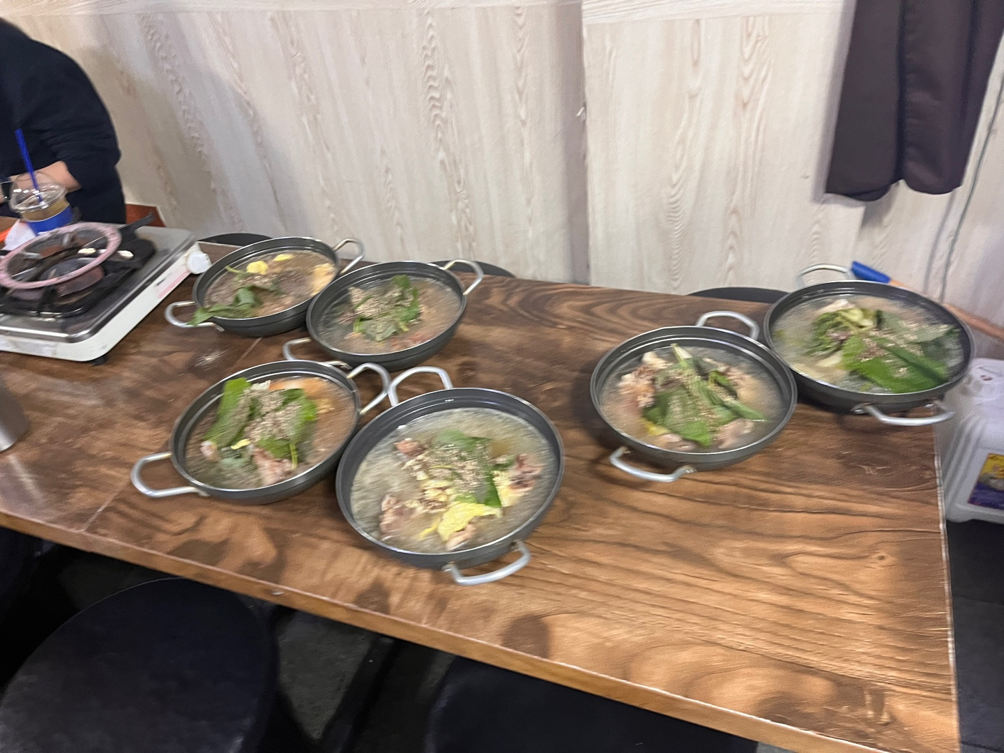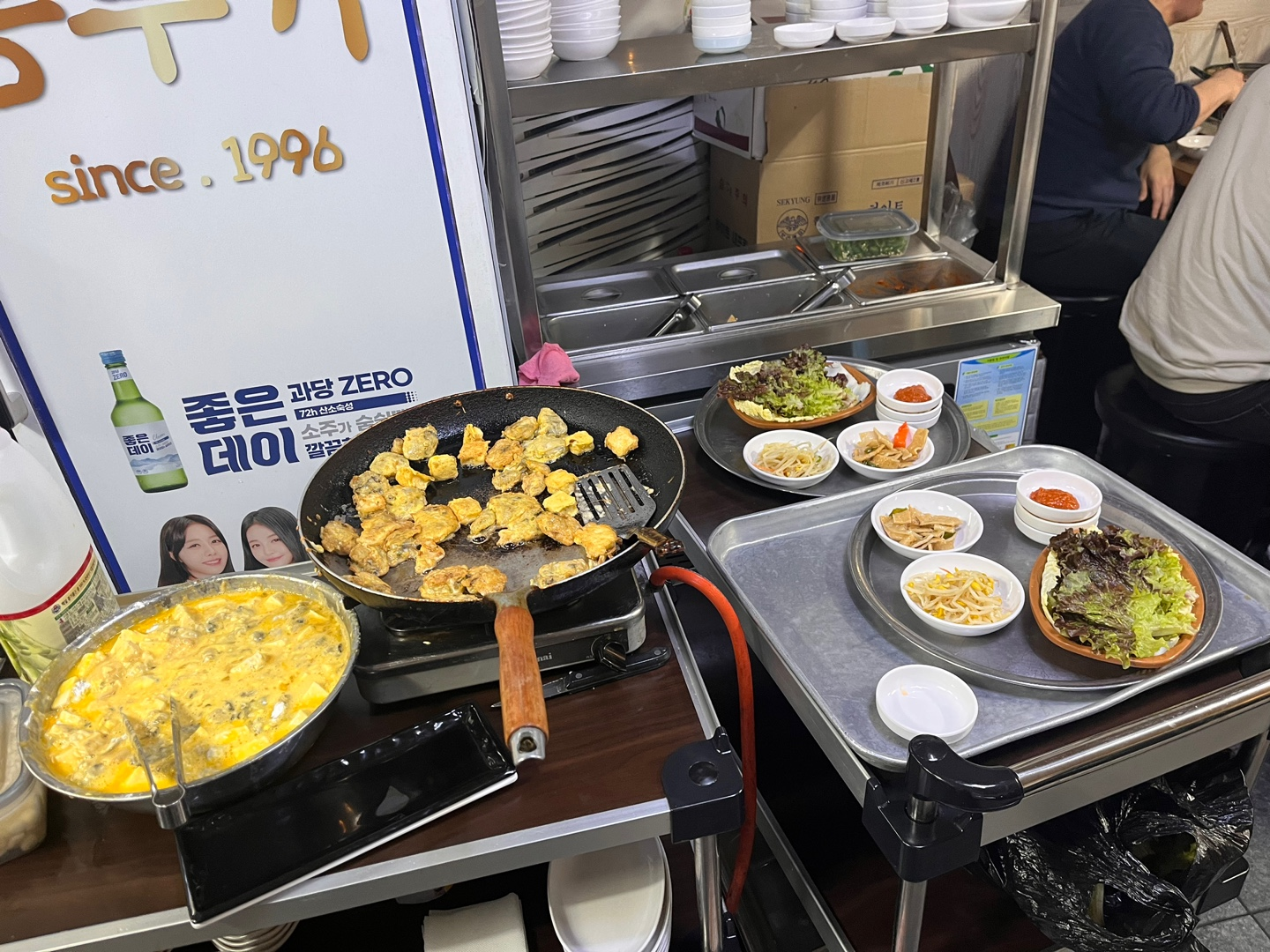 가게 한 편에서 서빙되기 기다리고 있는 감자탕들과 굴전! 굴전색이 노란 게 너무 맛있어보였어요~!