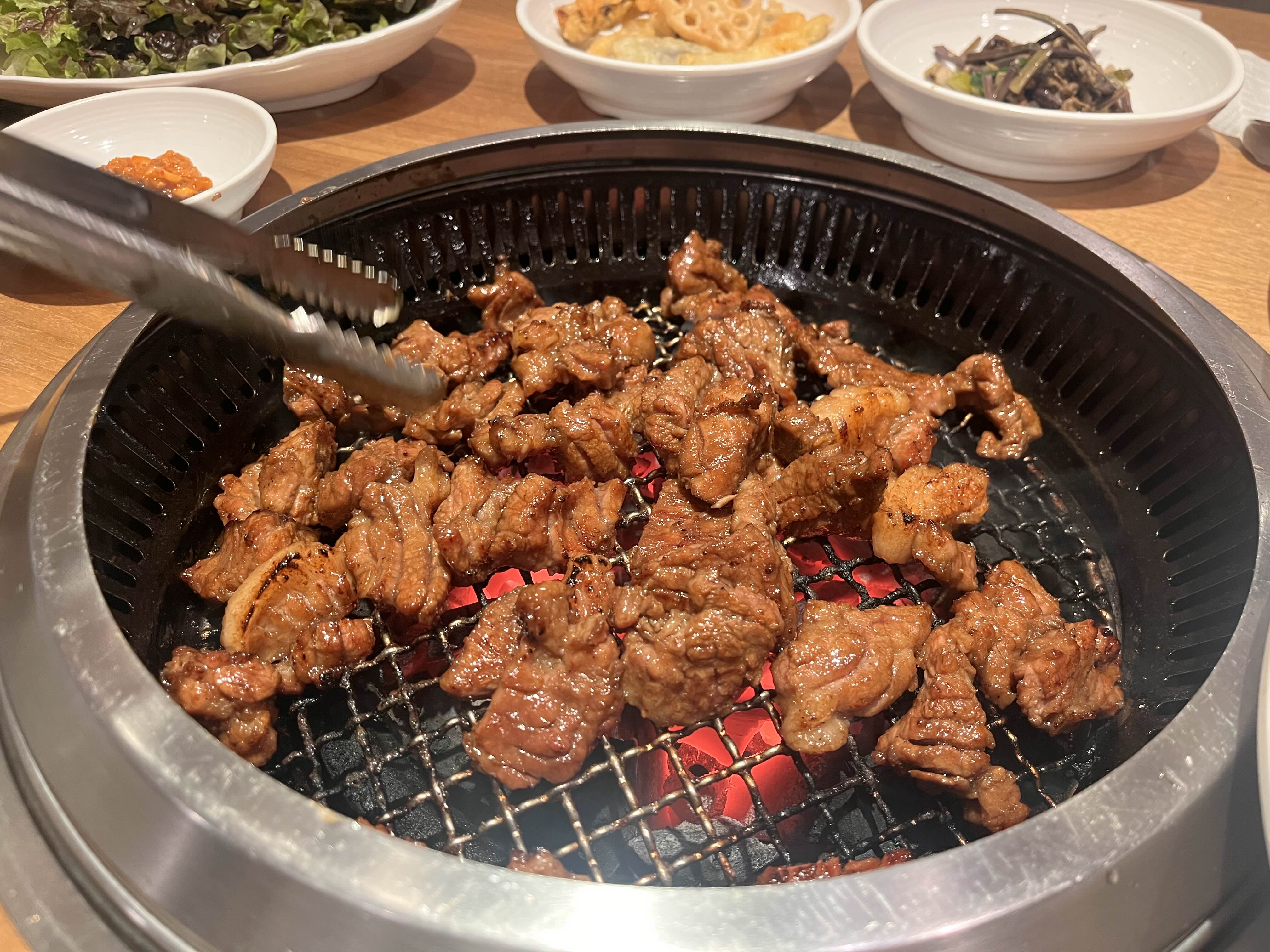 7명이라서 두 테이블에 앉았는데, 지금 숯불 위에 올라간 고기 네 덩이가 4인분이라고 보시면 됩니다.