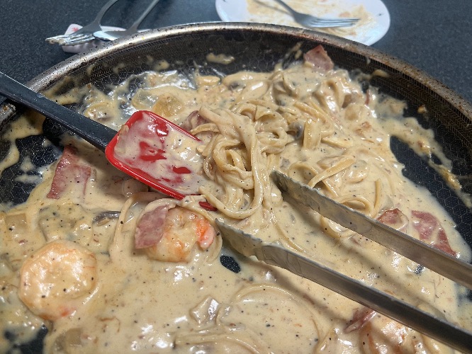 올리브오일에 양파 볶다가 베이컨이랑 냉동새우 해동한 걸 같이 넣고 볶다가,