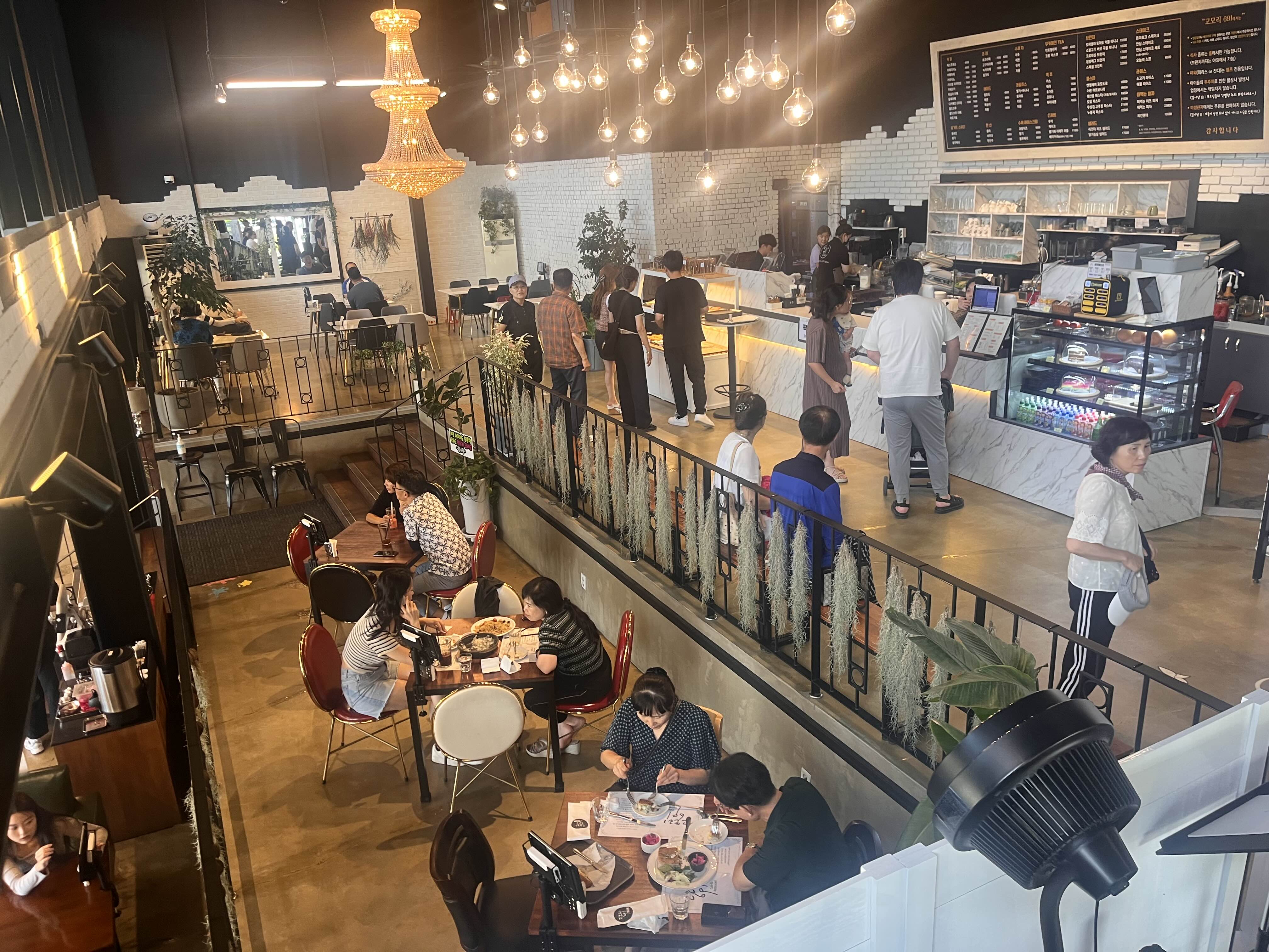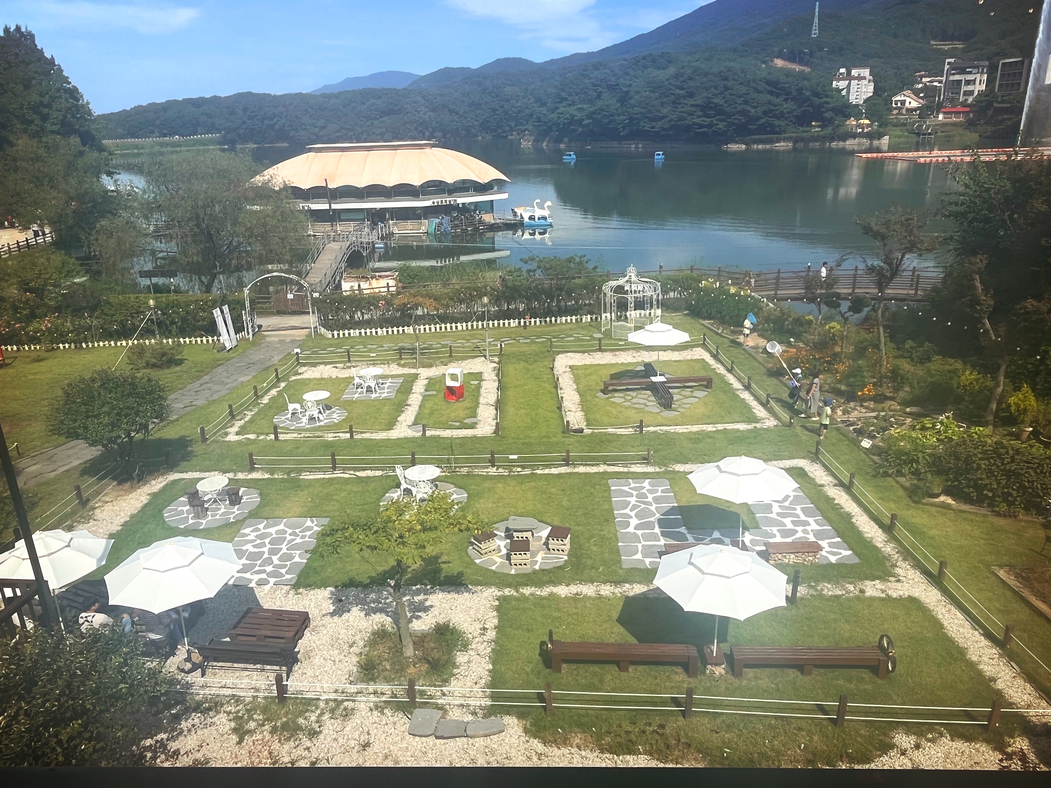가게도 특이한 구조라서 정원 쪽에 야외테이블도 있고, 건물는 1,2,3층이 있어요. 그 중 1,3층은 저수지나 정원이 창밖으로 보이는 자리가 많고 자리마다 배치되어 있는 키오스크로 카드선불주문이 가능해요~! 현금은 따로 직원 호출해야 하는듯!