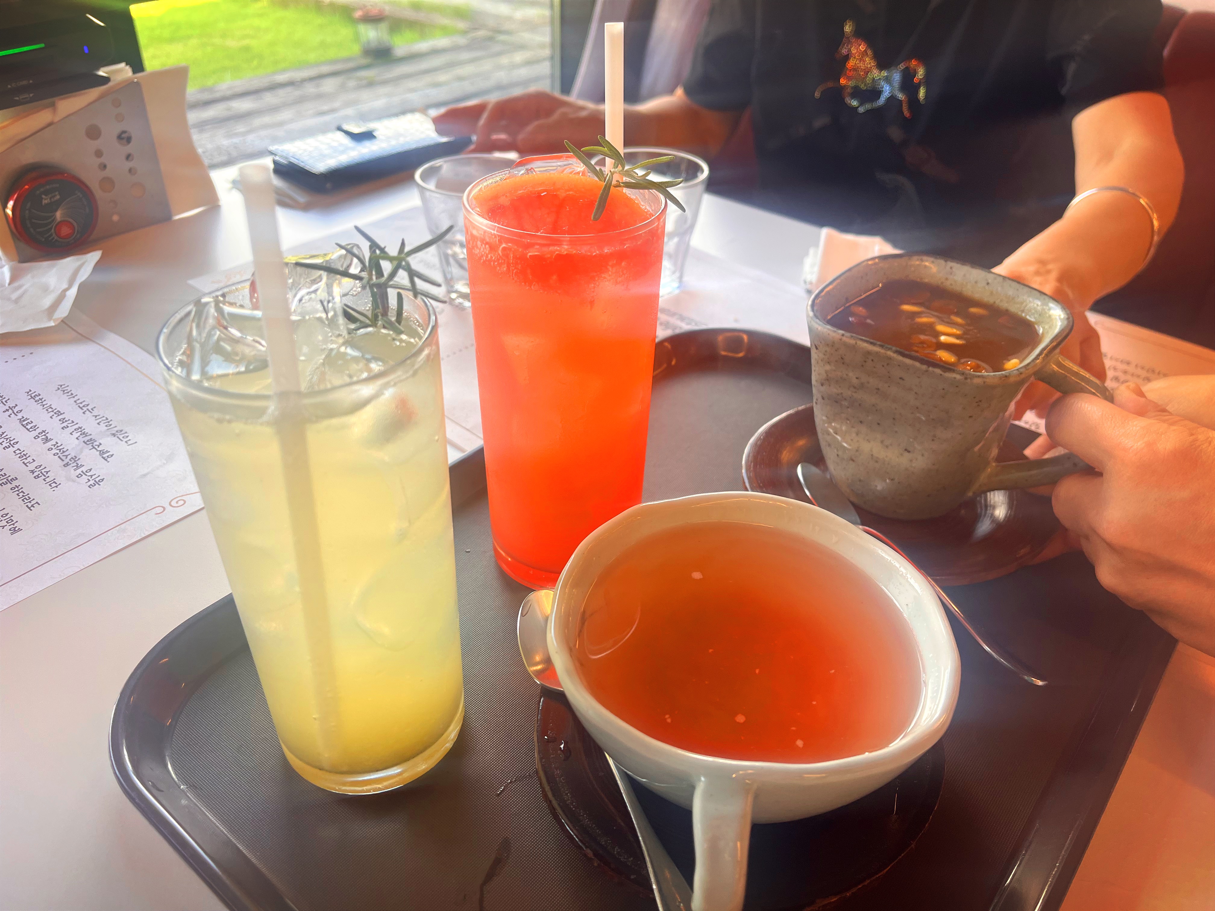 식사 후엔 대추차(8,500), 자몽차(8,000), 청포도에이드(8,000), 자몽에이드(8,000)를 주문했는데, 과일시럽을 쓰지 않고 생과일이 들어가서 상큼하고 적당히 달아서 너무 좋더라구요. 저는 그 패밀리레스토랑에서 가끔 주는 싼 에이드를 별로 좋아하지 않거든요. 여기는 비쥬얼도 이쁘고 과실이 듬뿍 들어 있어서 상큼했어요~ 다 청을 직접 담궈서 쓰신다고 하더라구요. 대추차도 녹진~해서 건강해지는 느낌이 드는 맛이었습니다.