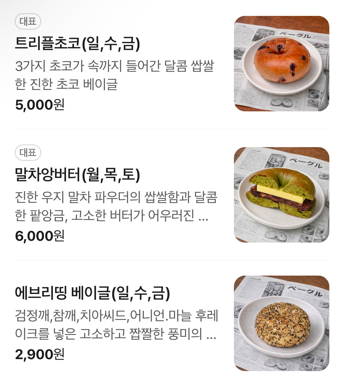 트리플초코, 말차앙버터, 에브리띵베이글, 잔슨빌치즈