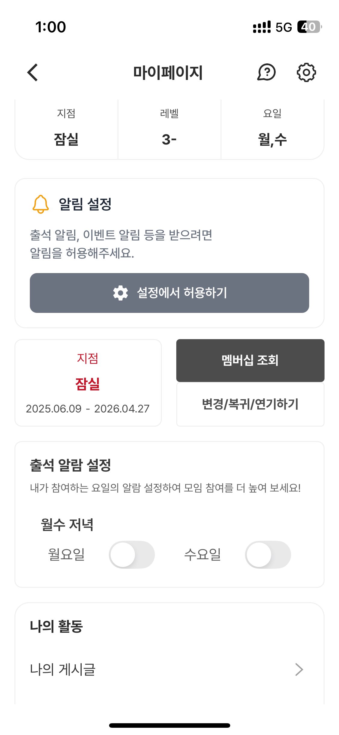 월수 수업을 듣다가 월요일 수업을 못 들어서 연기한다고 하면 다다음주 월요일부터 복귀 가능!