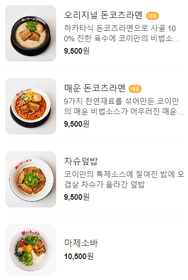 제가 라멘을 너무 좋아하는데, 여기는 뭔가 외관이 그렇게 맛있을 거 같진 않아서방이먹자골목을 자주 가면서도 한 번도 안 갔었거든요 ㅎㅎ 근데 방이먹자골목의 많은 점포들이 사라졌다가 생겼다가를 반복할동안계속 자리를 지키고 있길래 요번에 한 번 가보았어요.그리고 남친이 다니는 회사 고춧가루를 쓰는 곳이었더라구요!그래서 어떤 고춧가루를 쓰는지 아는데, 국내산 좋은 고춧가루를 쓰는 곳이라고 하더군요.코이라멘 체인점이던데, 왠지 다른 재료도 좋은 거 쓸 거 같은 신뢰감이 높아지면서..🤩고춧가루가 당연히 들어갈 거라 생각되는 [매운 돈코츠 라멘]으로 주문했습니다 ㅎㅎ