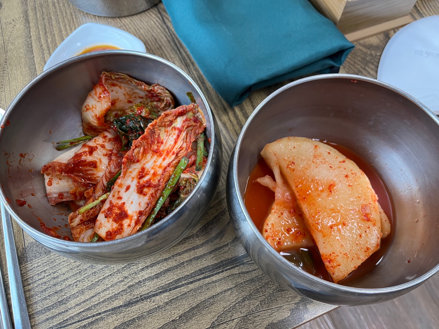 배추김치랑 무김치가 먼저 나왔는데, 너무 배고파서 한그릇 먼저 뚝딱해버렸네요. 김치도 진짜 너무 맛있었어요! 시장이 반찬이라 더 맛있었던 것도 있었겠지만 저희 말고 다른 테이블은 몇 번이나 김치를 리필하시더라구요.
