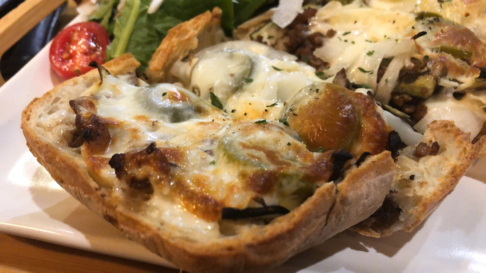 촉촉한 치아바타 위에 얇게 썬 가지슬라이스가 올려지고