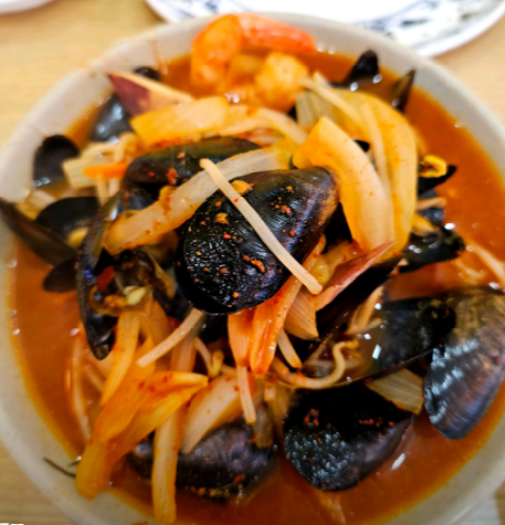 해산물도 홍합, 오징어가 가득 들어 있고 오동통한 새우도 2개 들어가 있었습니다.