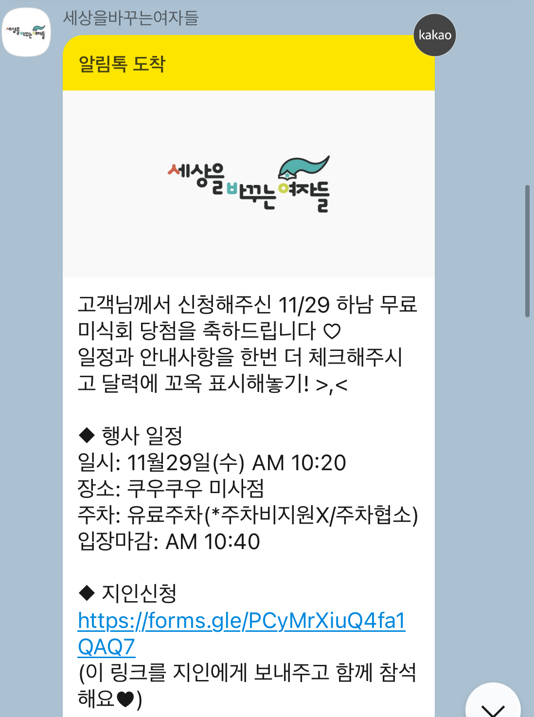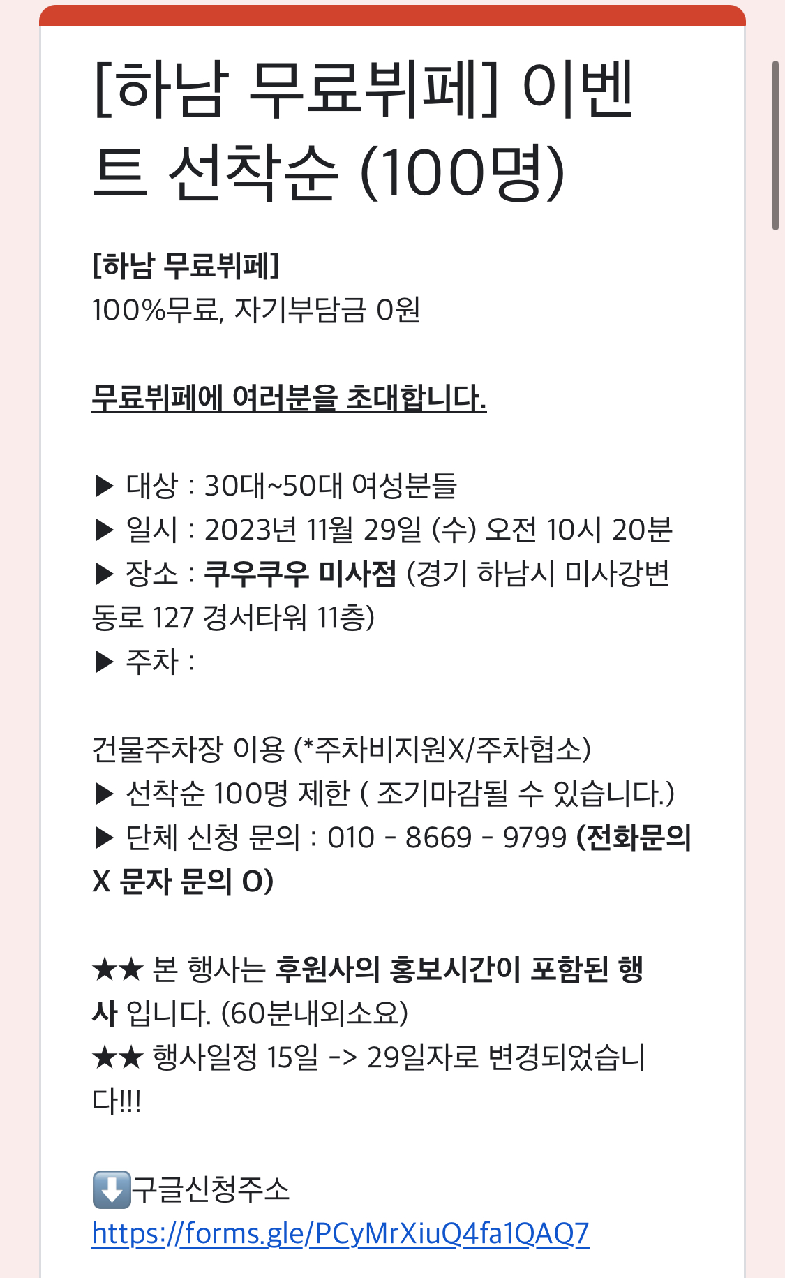 인스타그램에서, 하남에서 여자들만을 위한 무료미식회를 연다는 광고를 보고 신청하게 되었는데요. 미식회 장소가 그냥 케이터링이 아니고 초밥뷔페인 "쿠우쿠우"라고 해서 기대가 많이 되었어요. 구글신청폼 작성해서 제출하고 며칠 지나지 않아 카톡으로 당첨메시지를 받았습니다. 보통 뷔페권 준다고 하면 1인 2장씩이다보니 친구랑 같이 가야지 생각했는데, 다시 확인해보니 다 개별적으로 신청해야되더라구요. 선착순 100명이라고 해서 될까 했는데, 다행히 중간에 날짜가 변경되서 그런지 널널하게 당첨된 거 같았어요.