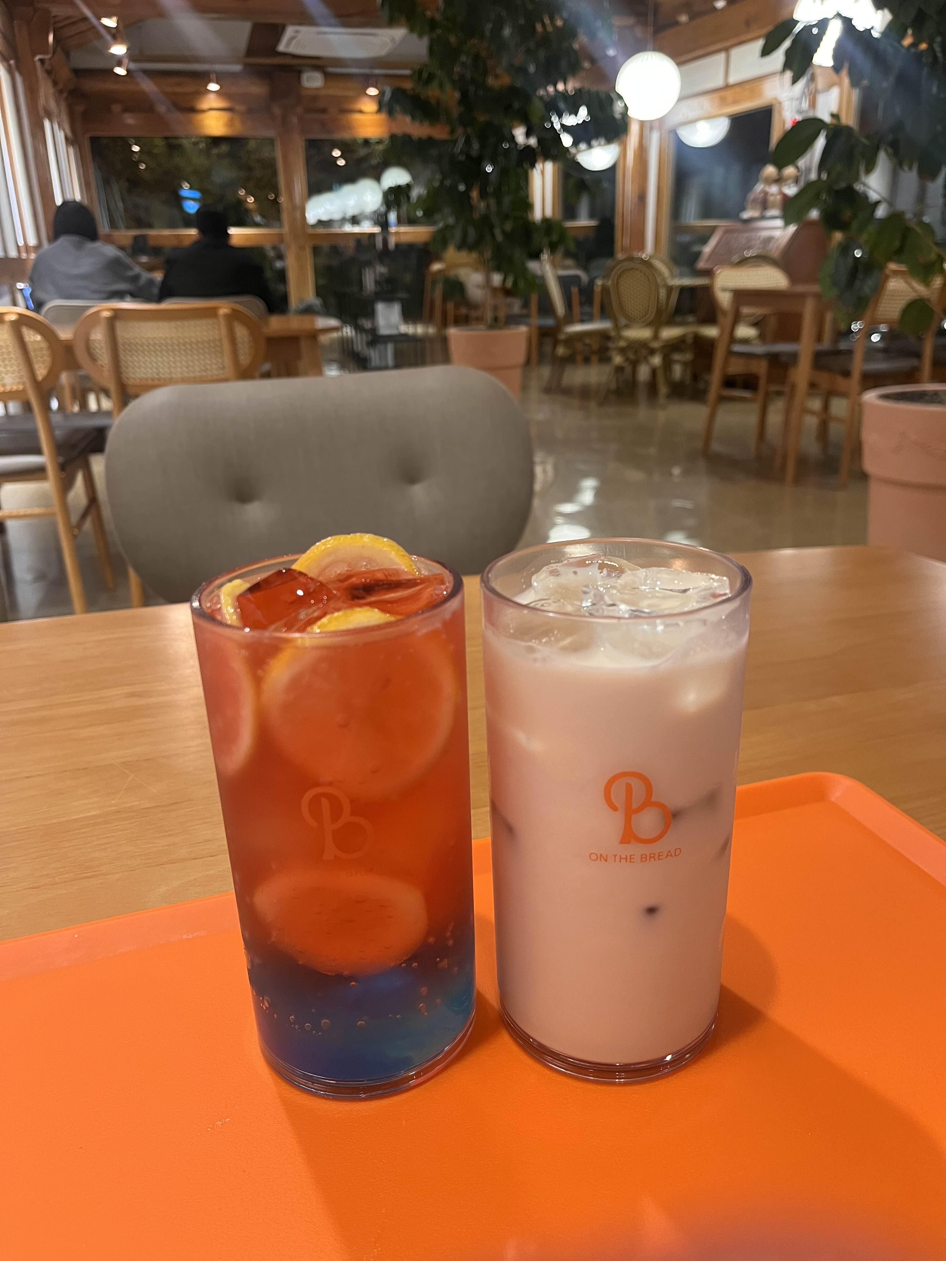 꽤 늦은 시간인데도 사람이 꽤 있었어요. 내부가 생각보다 엄청 넓고 세련됐더라구요. 통창에 천장이 서까래라서 높기 때문에 개방적인 느낌도 있고 좋았답니다. 디저트도 먹을까 하다가 넘 배불러서 음료만 온더에이드(7,000), 밀크티(6,000) 요렇게 시켰어요. 가격은 꽤 높은 편이네요ㅎㅎ온더에이드는 이 집 시그니쳐 음료래요. 다른 에이드들도 그럴 거 같긴 한데, 레몬슬라이스가 큼지막하게 들어가있고 자몽에이드반/블루레몬에이드반 해서 색깔이 넘 예뻤어요! 맛도 싸구려맛 아니고 직접 청 담근 맛?